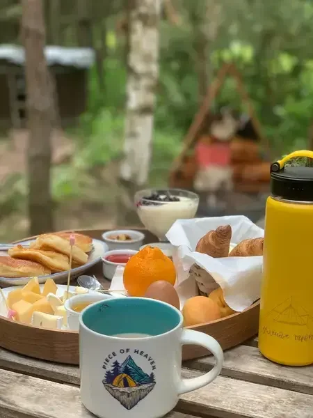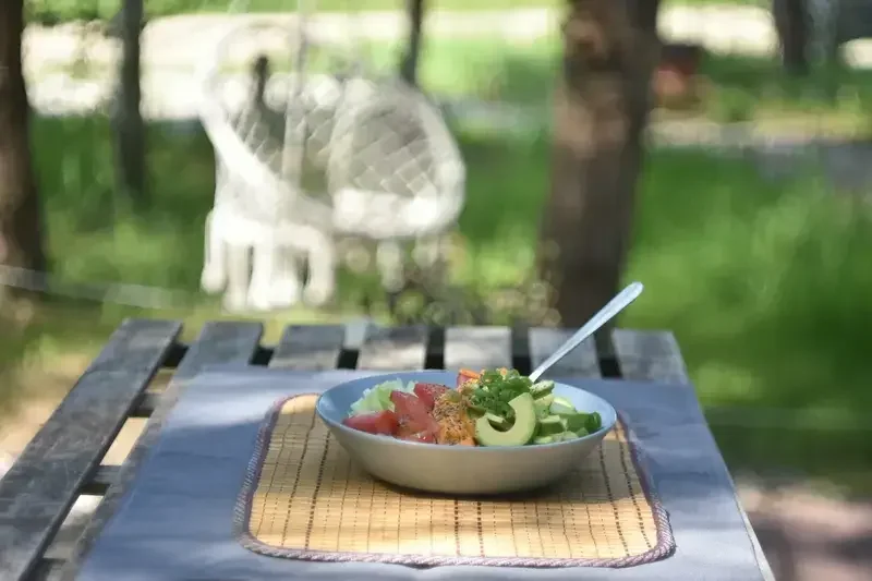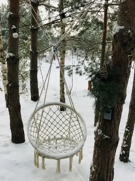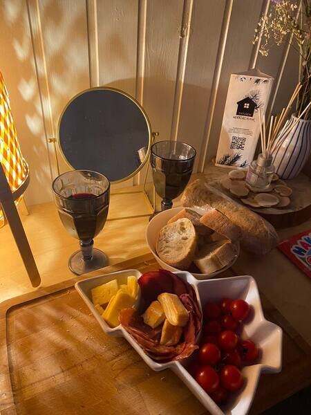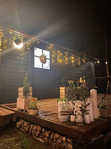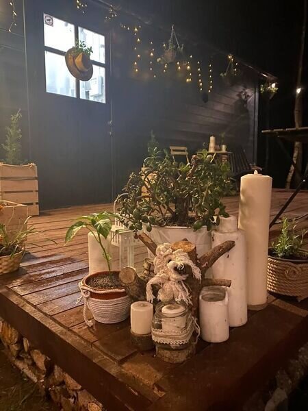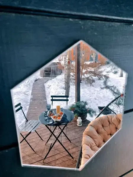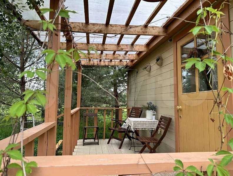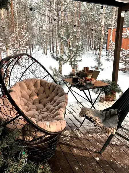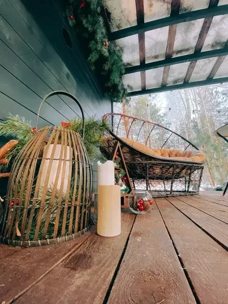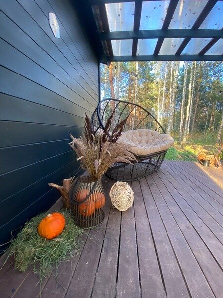 На территории есть уютная зона для отдыха на свежем воздухе. Гости могут расположиться на мягкой комфортной софе в уютном пледе и насладиться ароматным кофе или чаем, любуясь красивым пейзажем вокруг.