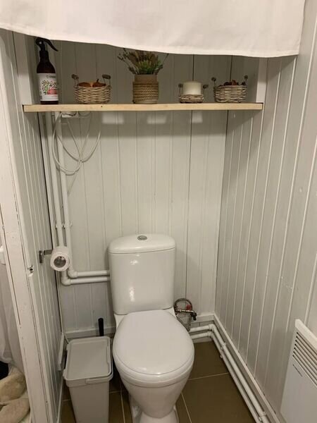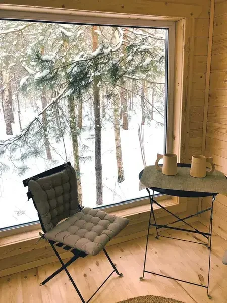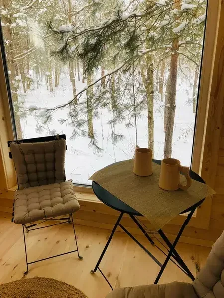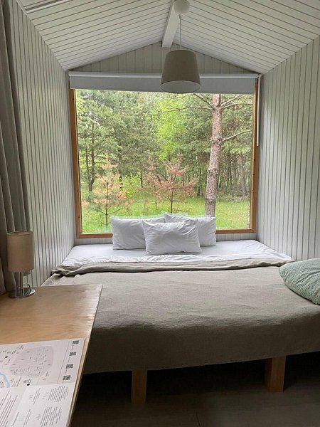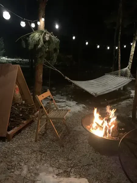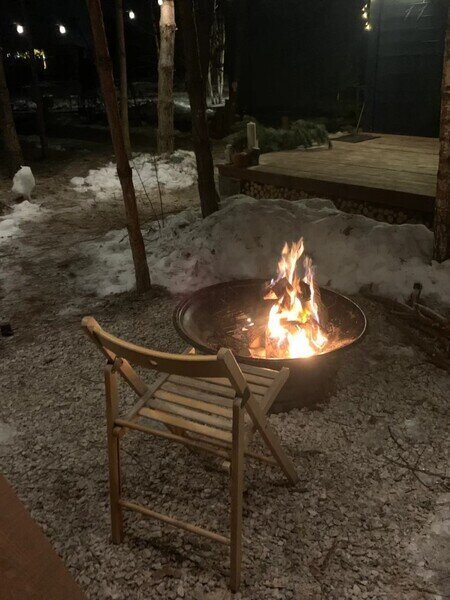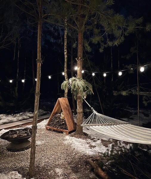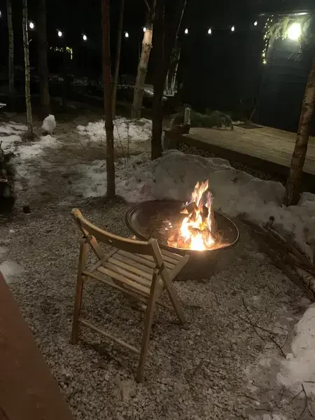 Костровая чаша на территории пригодна для проведения вечерних посиделок, где можно слушать треск поленьев и жарить маршмеллоу. В «Можжевельнике» предусмотрены все удобства для комфортного отдыха на природе, включая кофемашину, проектор, мини-кухню, туалет и душ.