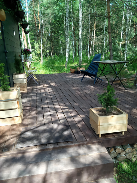 Рядом с домиком есть уютная дровяная банька, где можно расслабиться и насладиться ароматом горящих дров, использовать свежие травяные запарки и веники текущего сезона для усиления эффекта от банных процедур. На территории также есть уютная зона для отдыха на свежем воздухе, где можно насладиться ароматным кофе или чаем, любуясь красивым пейзажем вокруг.
