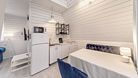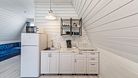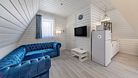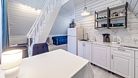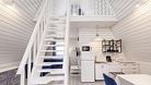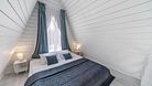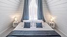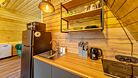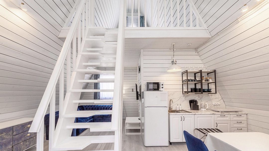 На первом этаже располагается кухня-гостиная и совмещенный санузел. На втором этаже — спальня с двуспальной кроватью.