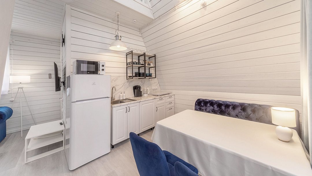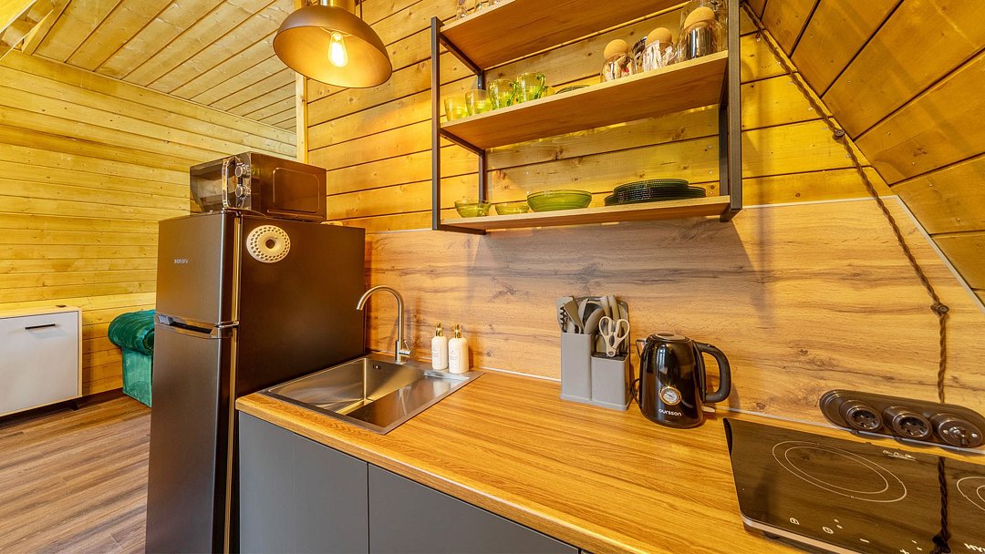 - оборудованная кухня (холодильник, индукционная плита, чайник, посуда);