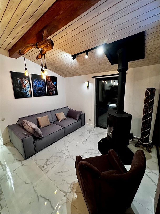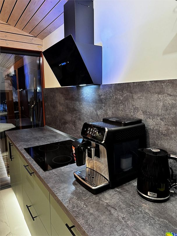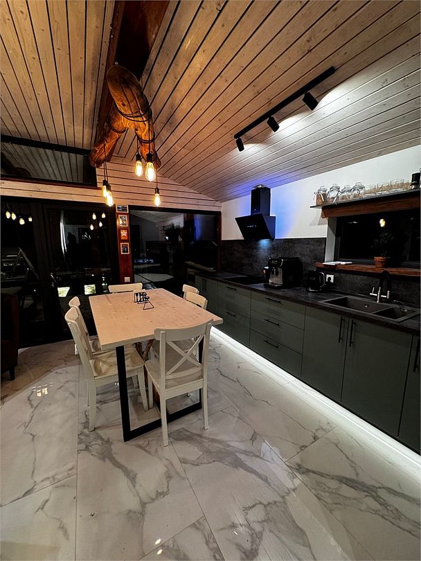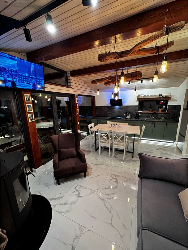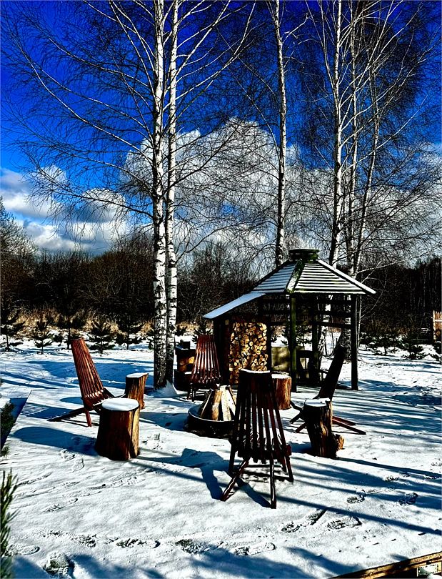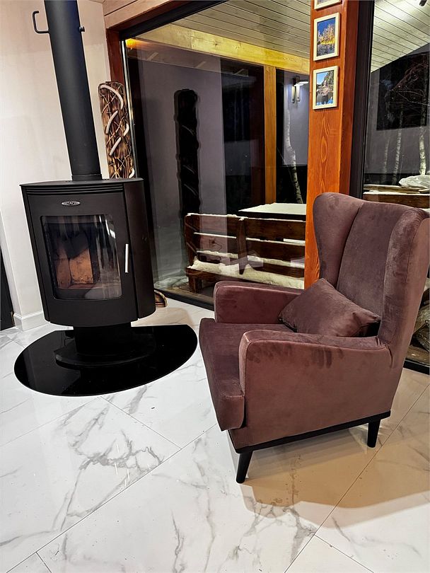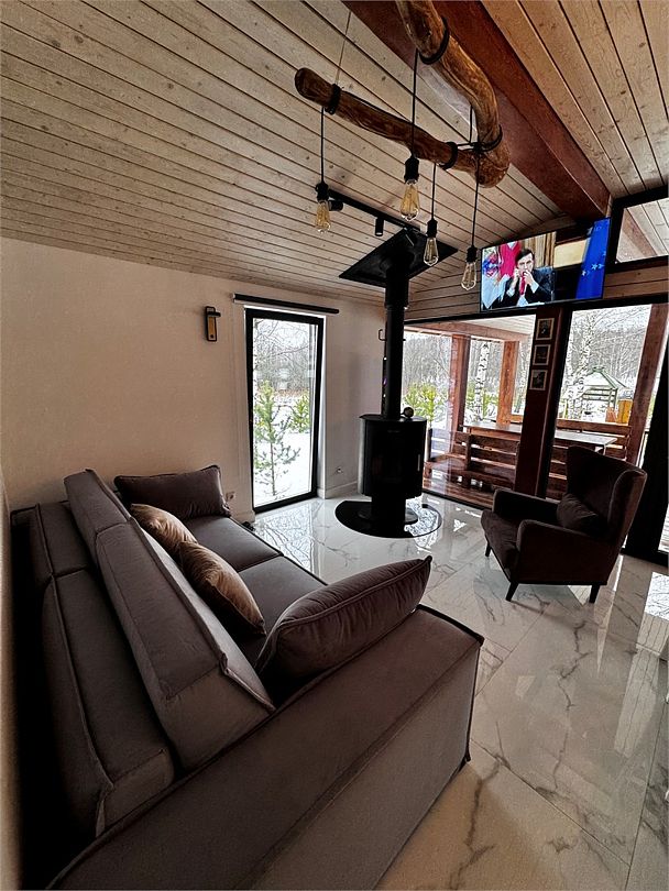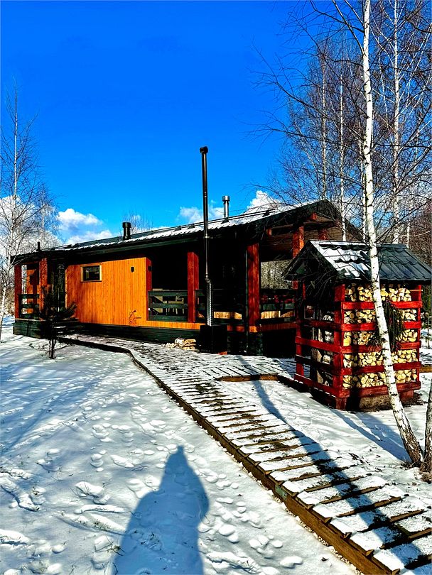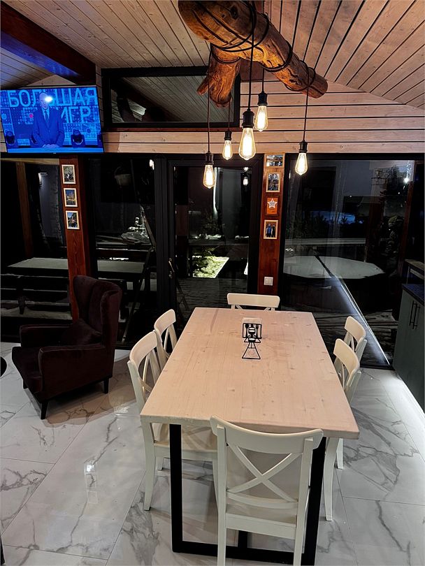 - кухня-гостиная с дровяным камином. Мягкая мебель: глубокий диван-кровать и каминное кресло, журнальный столик и смарт-ТВ (HDMI и возможностью подключения внешних устройств, игровых приставок). Кондиционер и WiFi - Usadba guest (без пароля). Полноценная кухня с обеденным столом на 6 персон. Укомплектована: СВЧ, кофемашина (зёрна), чайник, холодильник, варочная панель. Посуда на 6 персон, бокалы для вина и Rocks для виски, свечи, кухонная утварь (кастрюли, сковорода). Специи, крупы для завтрака, чай черный, зелёный, подсолнечное масло, а также наш комплемент: деревенские яйца, масло и свой Мёд. Панорамные окна в пол и выход на веранду 25 кв. м к бассейну-джакузи и к Патио, где расположены мангал, костровая зона с креслами и дровницей с сухими дровами.