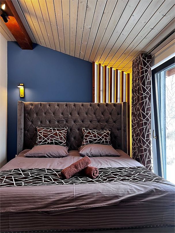 На втором этаже спальная зона с большой двуспальной кроватью KingSize. В спальне также большое панорамное окно с видом на лес и озеро.