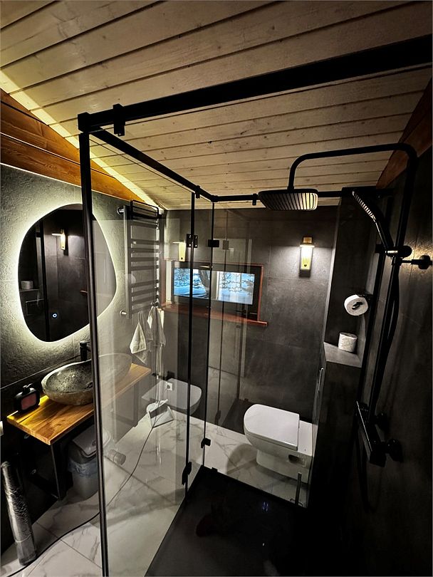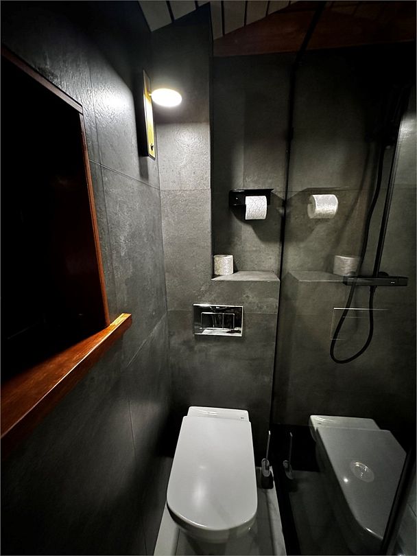 Ванная комната с с/у и душевой кабиной, зеркало, индивидуальные средства гигиены, фен, 2 банных халата, одноразовые тапочки. Бойлер с горячей водой.