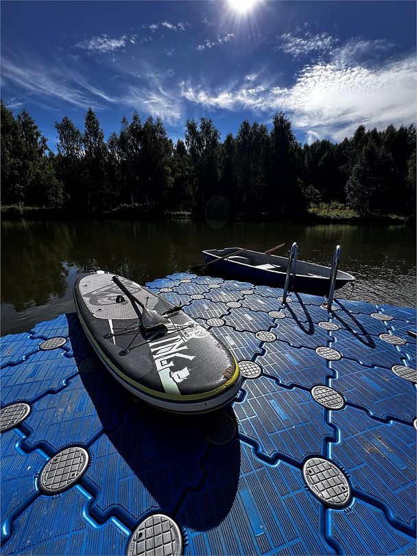 Рядом с Избой расположены: пирс, песочный пляж с шезлонгами и гамаки на деревьях.
