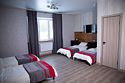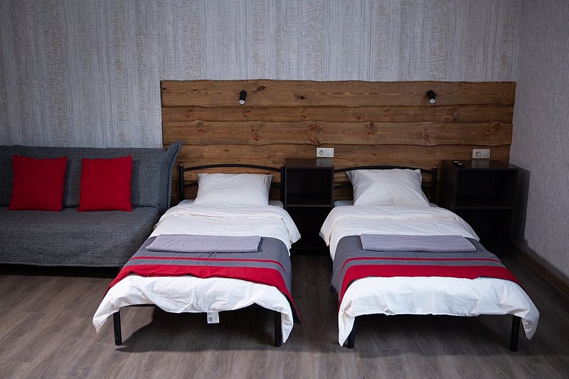 3х местные с 3-мя раздельными кроватями или двуспальной кроватью и 1 софой; все номера с собственной ванной комнатой (душевая кабина, раковина, унитаз, полотенца и принадлежности индивидуального пользования), TV и бесплатный Wi-fi.