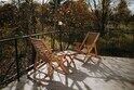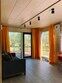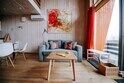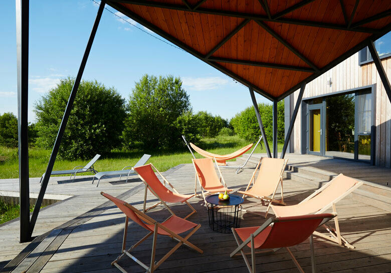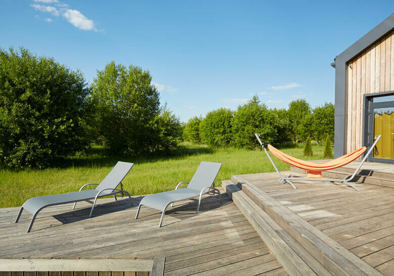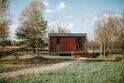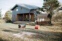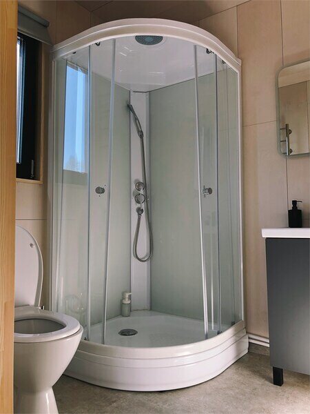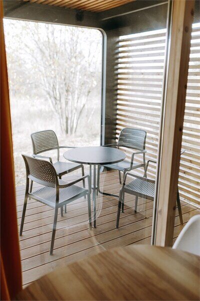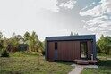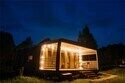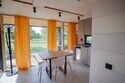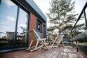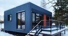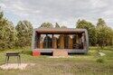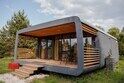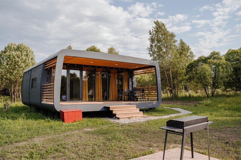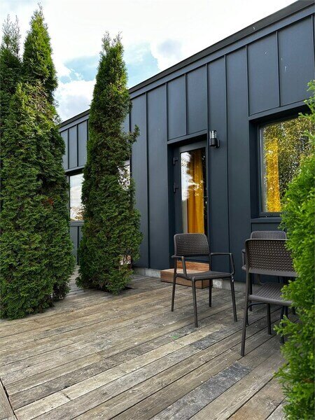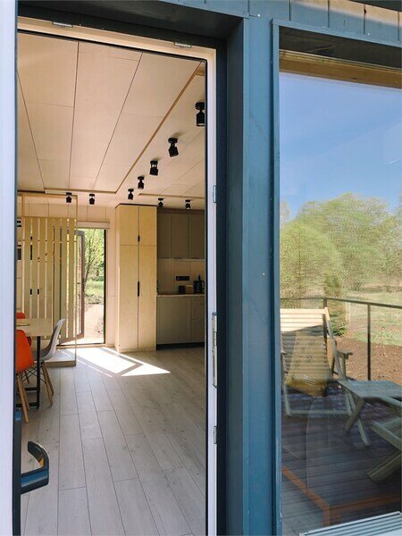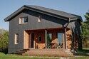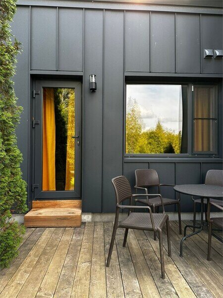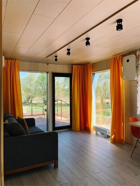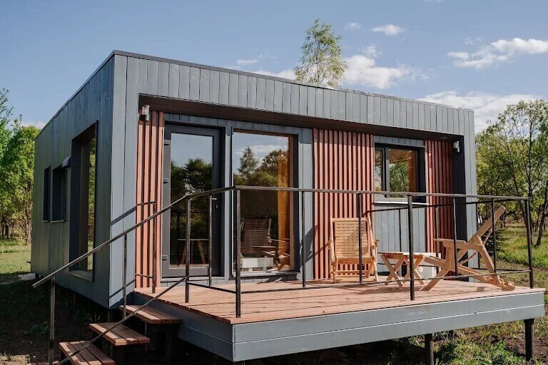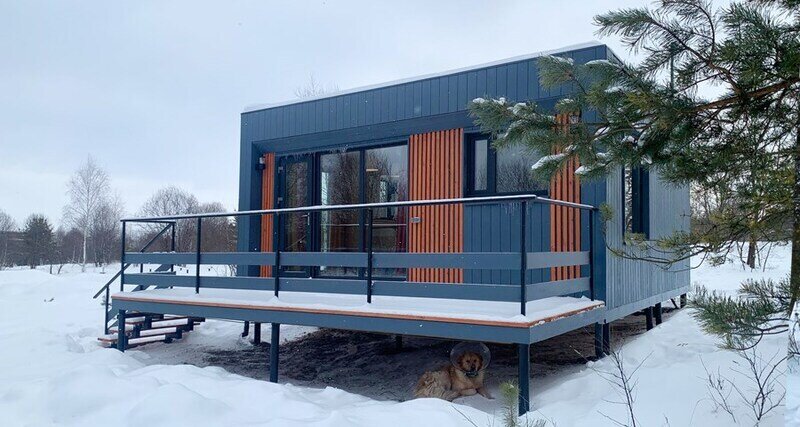 Одноэтажный компактный модульный дом с террасой и панорамным окном-стеной. В доме: гостиная с диваном-кроватью, креслами, журнальным столом и оборудованной кухней, две отдельных спальни с двуспальными кроватями. Удобства: 1 отдельный с\у с душем, утюг, гладильная доска.