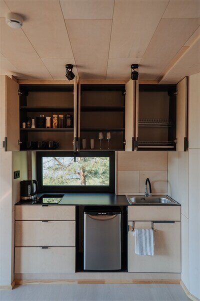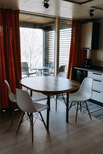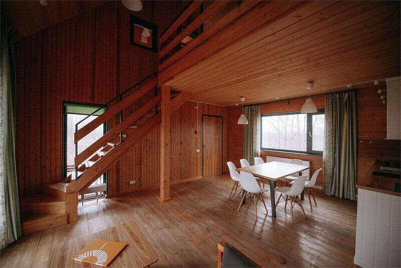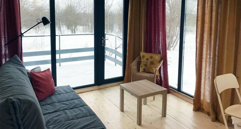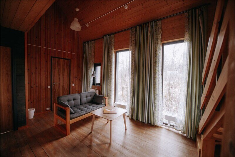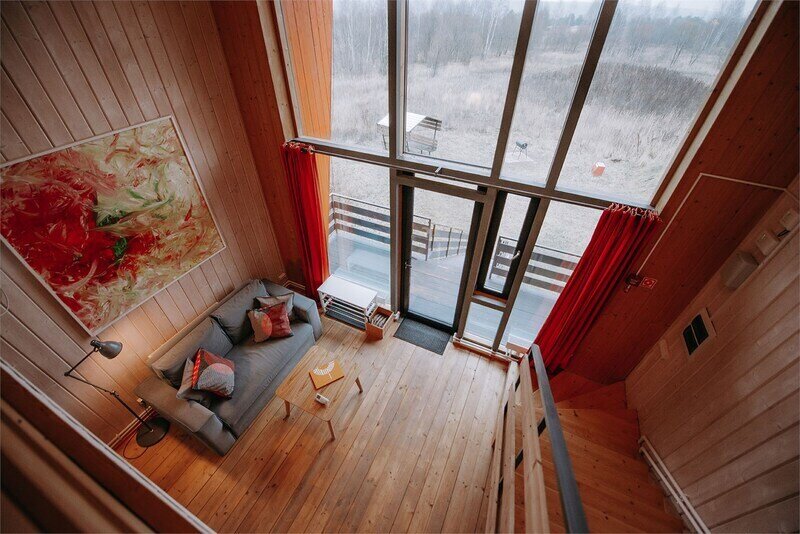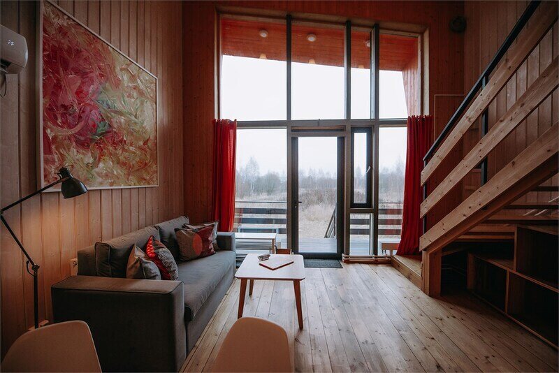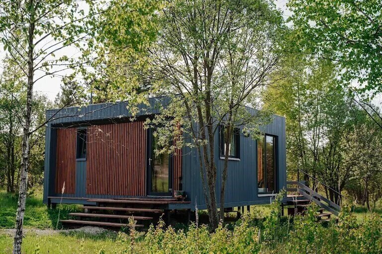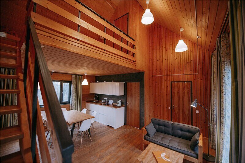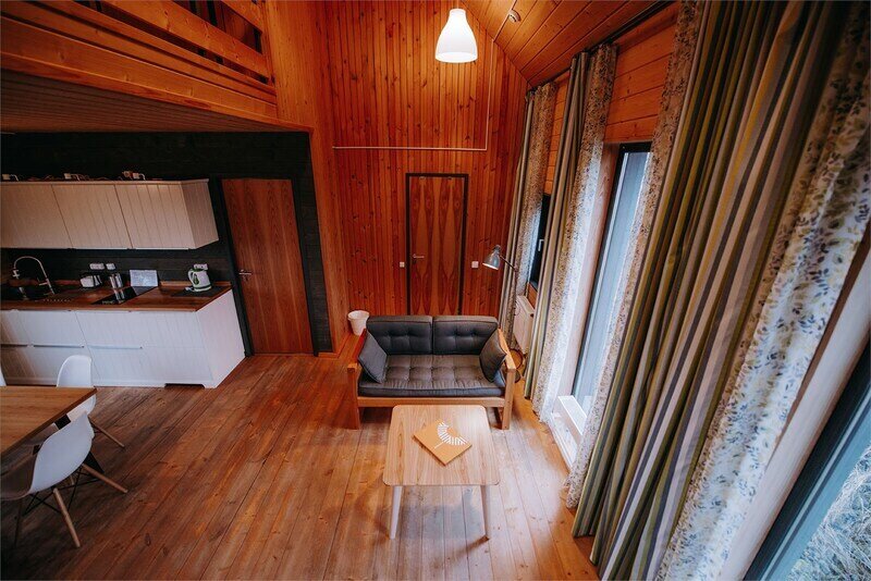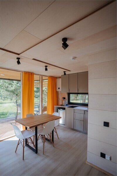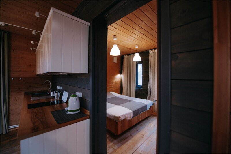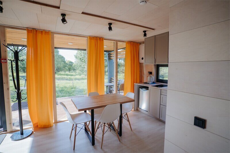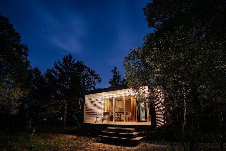 Компактные авторские архитектурные дома с панорамным видом на лес. В доме две двуспальные кровати на 2 уровнях, зона гостиной, оборудованная кухня, санузел с душем, утюг, гладильная доска.