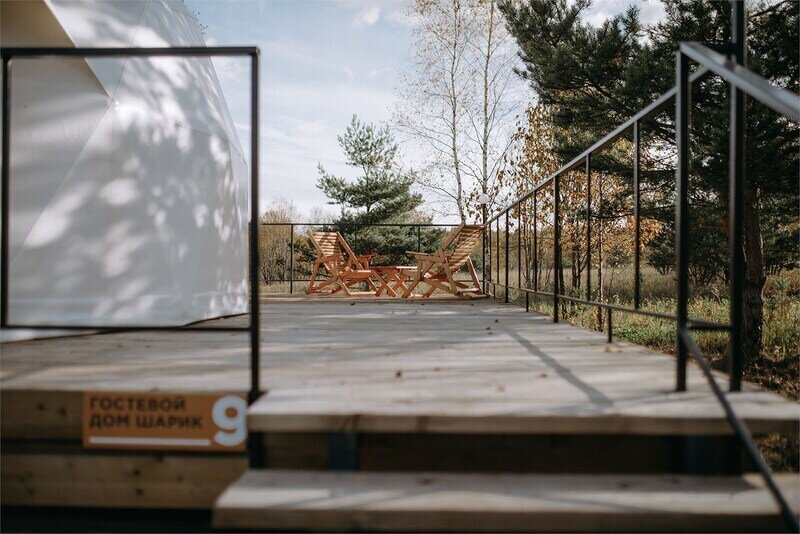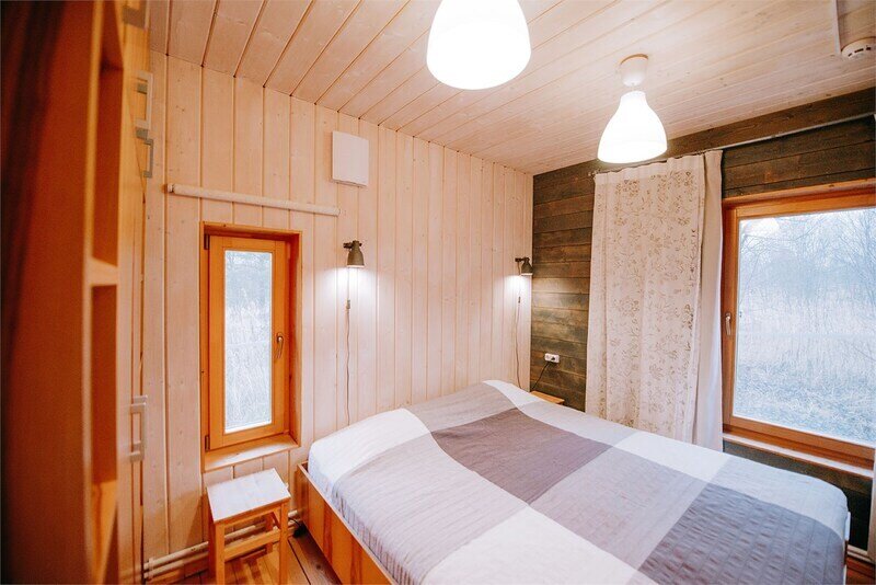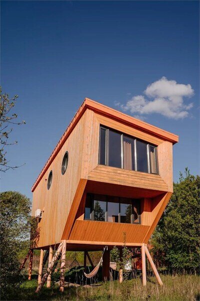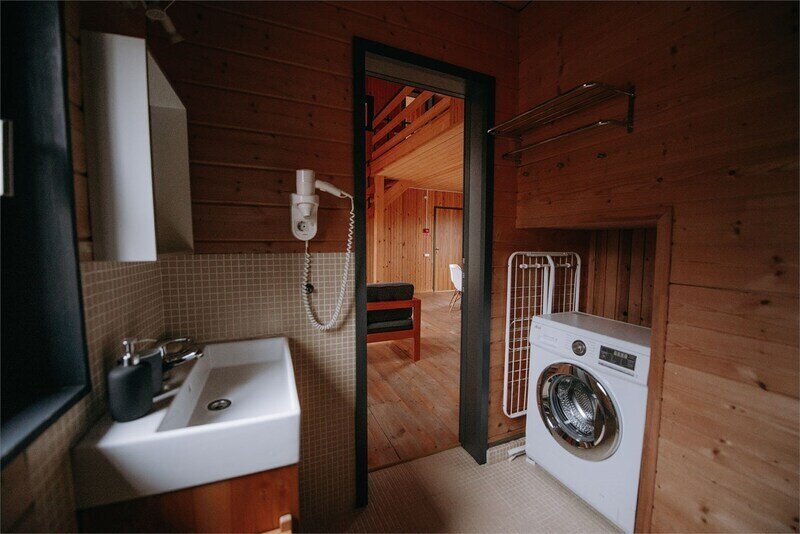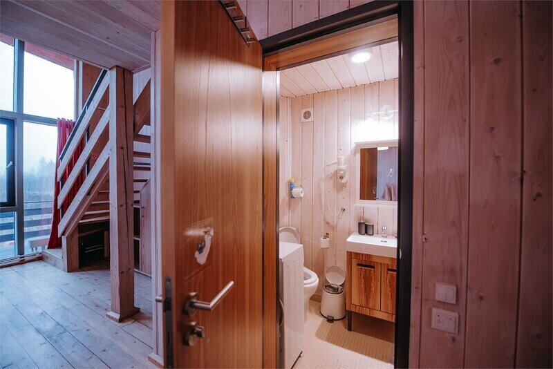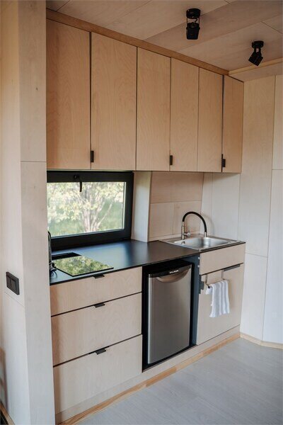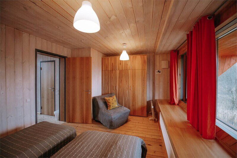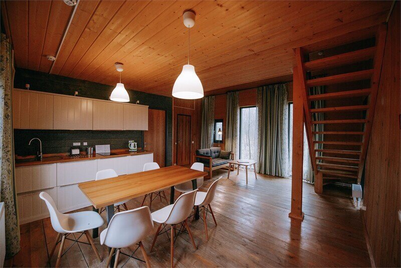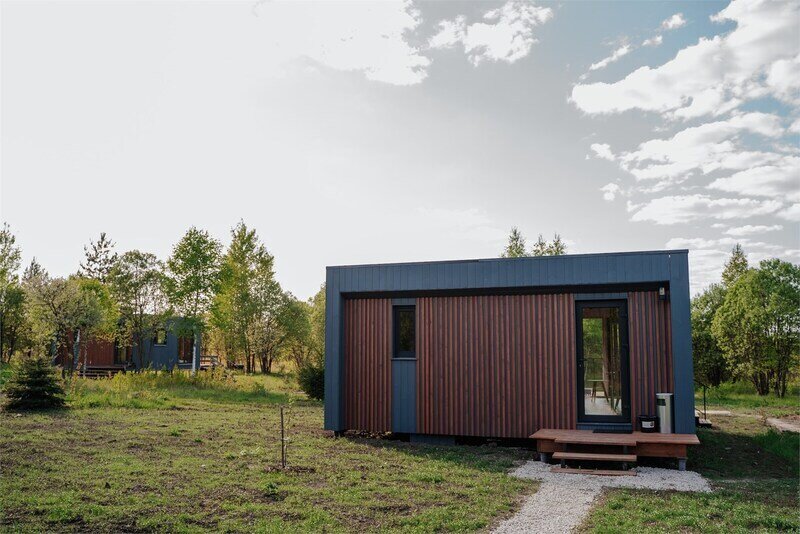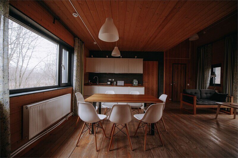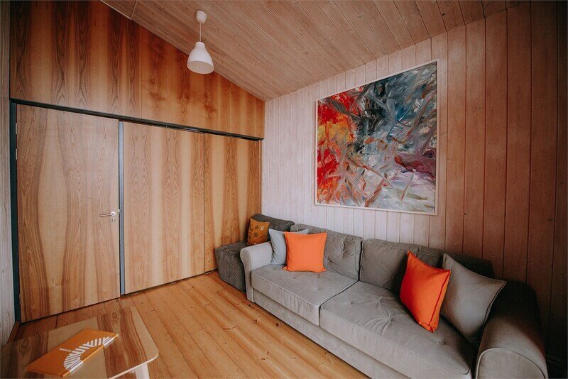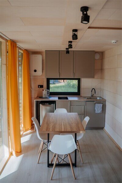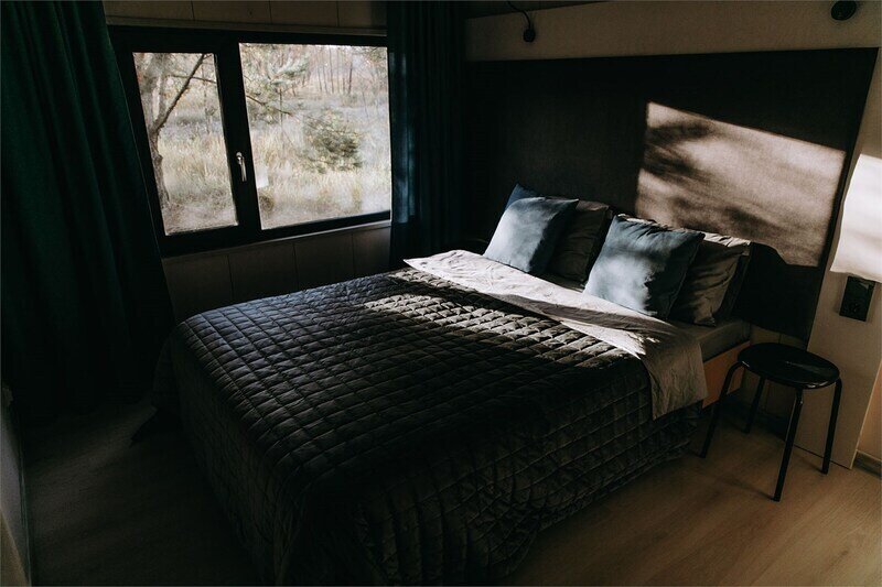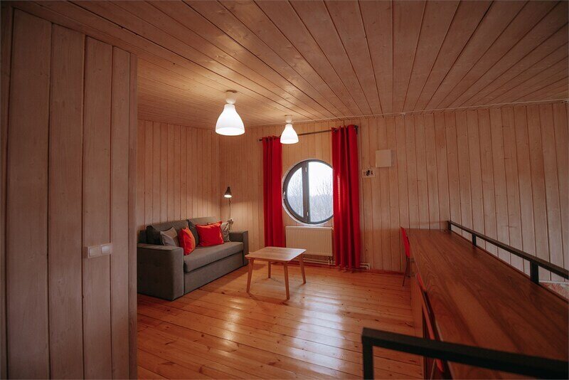 Компактные авторские архитектурные дома с панорамным видом на лес. В доме две двуспальные кровати на 2 уровнях, зона гостиной, оборудованная кухня, санузел с душем, утюг, гладильная доска.