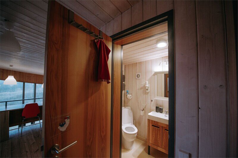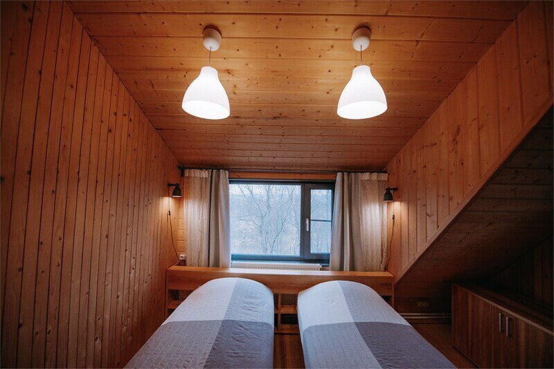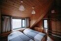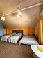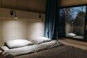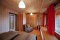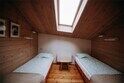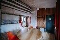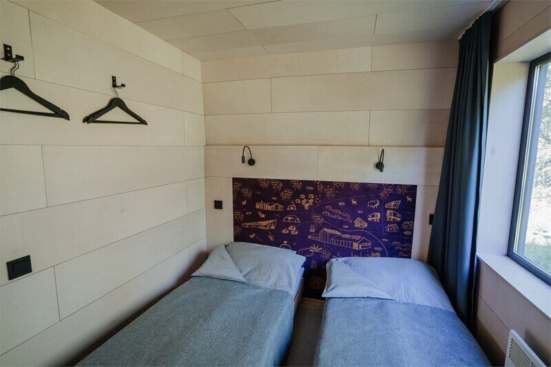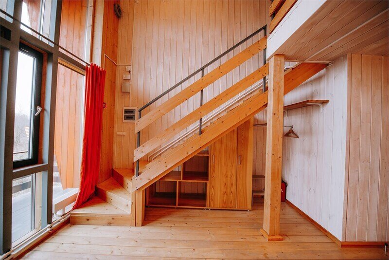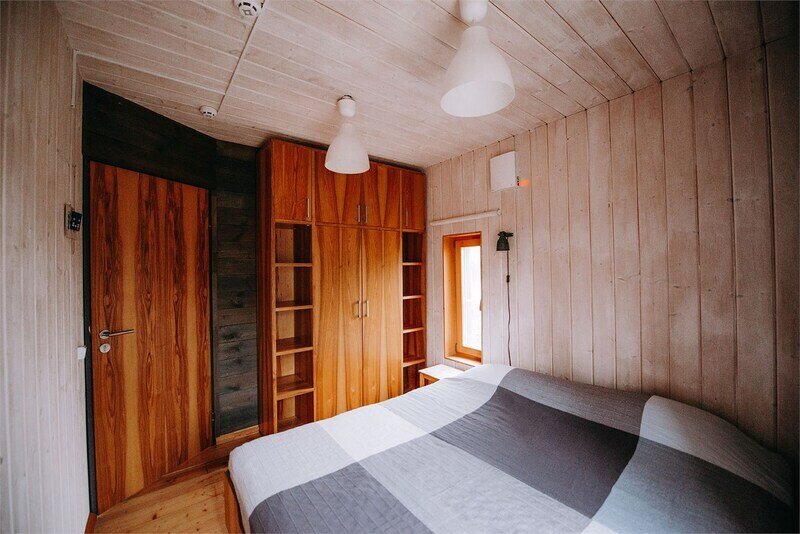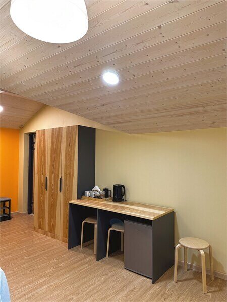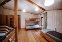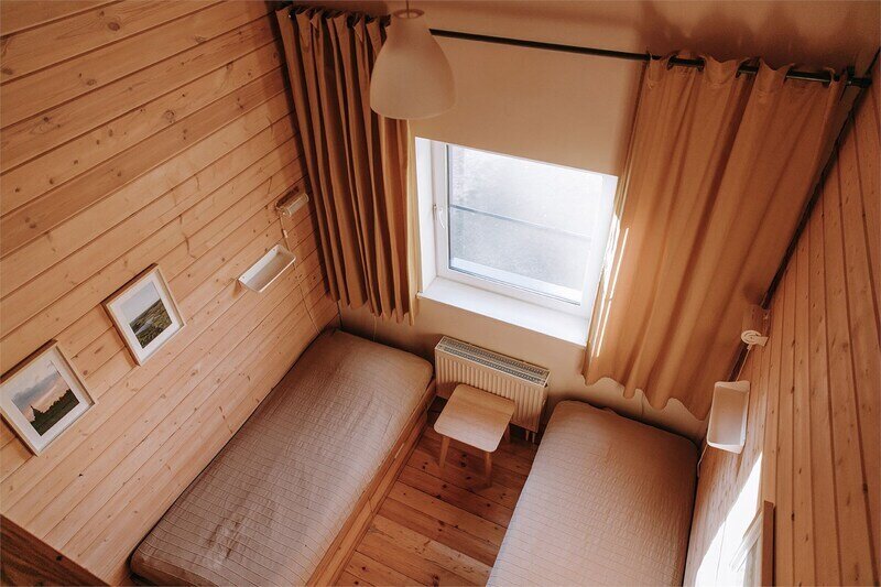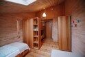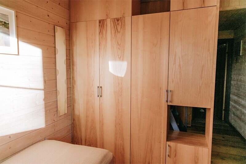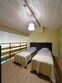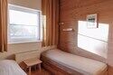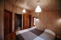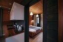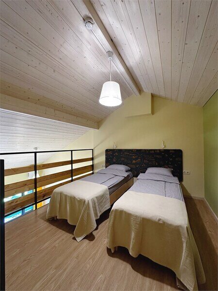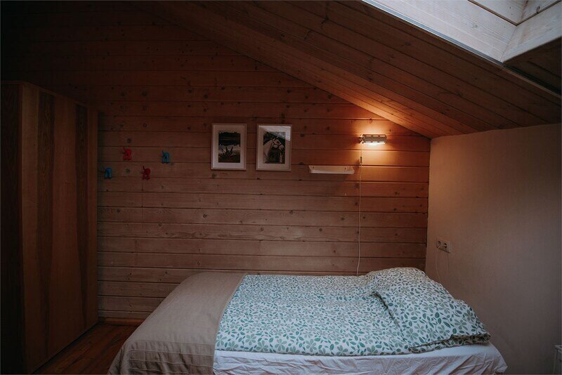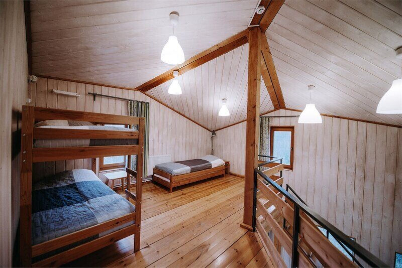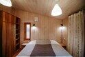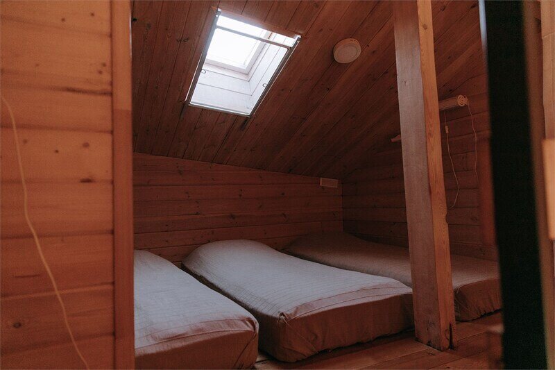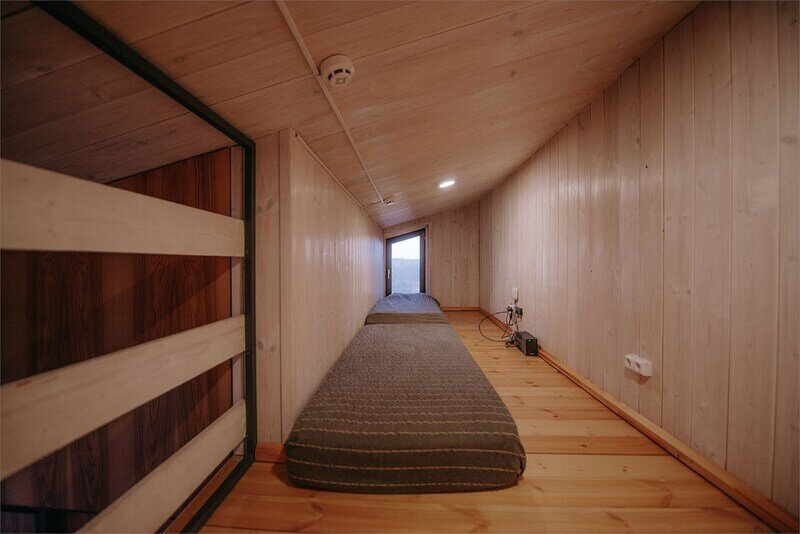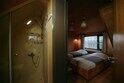 Стандартный номер на 4-х гостей имеет всего одну двуярусную кровать, отделенную шкафом-перегородкой от двух односпальных кроватей у мансардного окна. Все номера выполнены в дереве, имеют достаточно мест для размещения вещей во встроенных шкафах, у каждого спального места есть своя подсветка, полочка для подзарядки гаджетов.