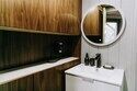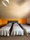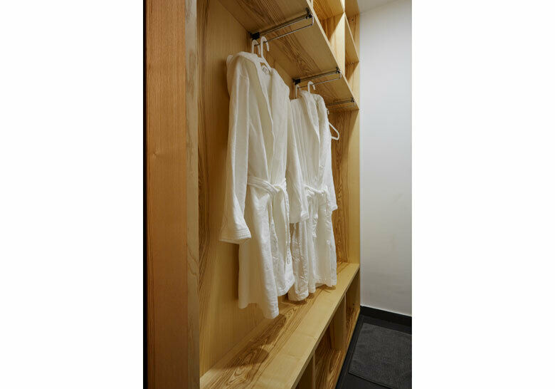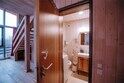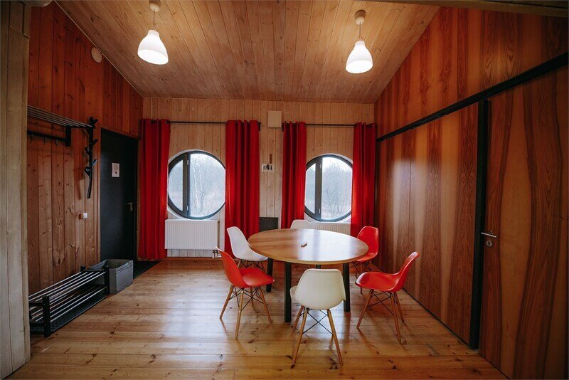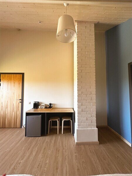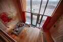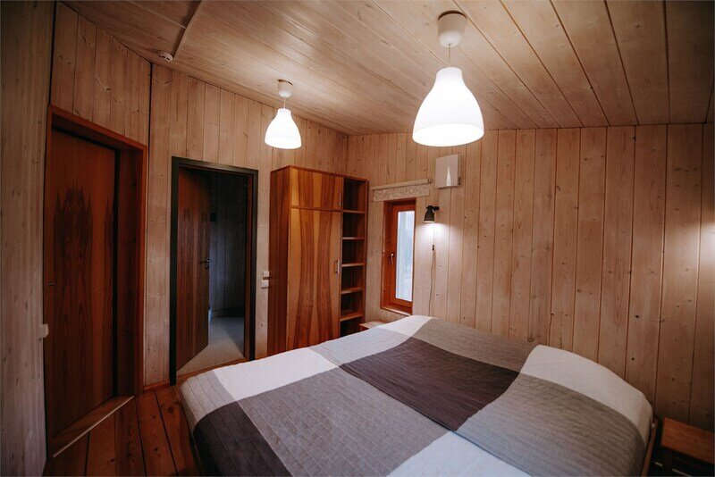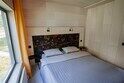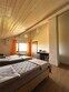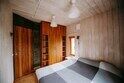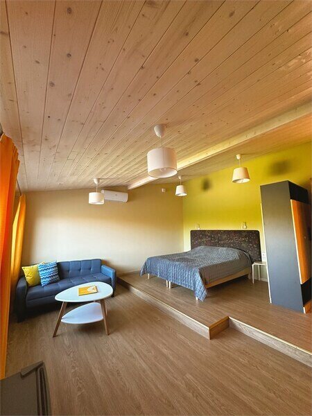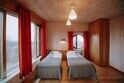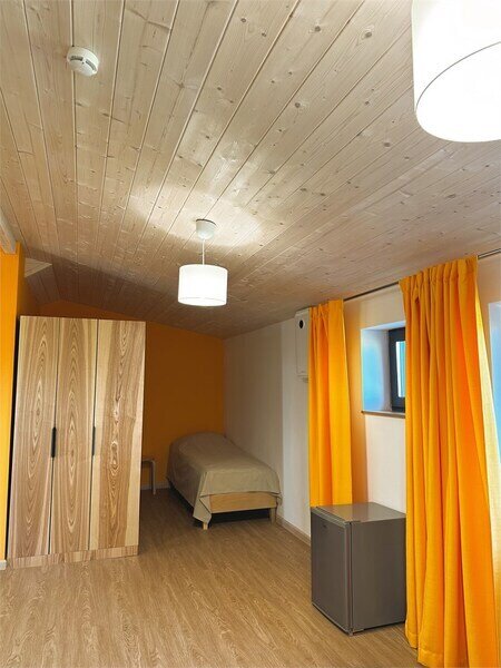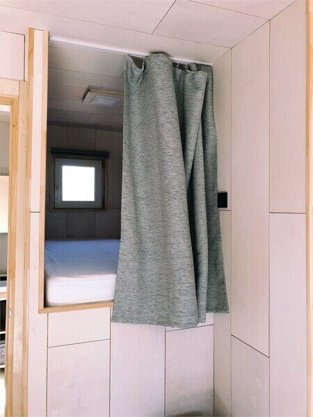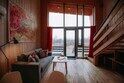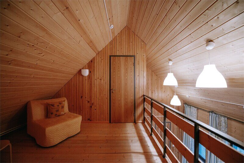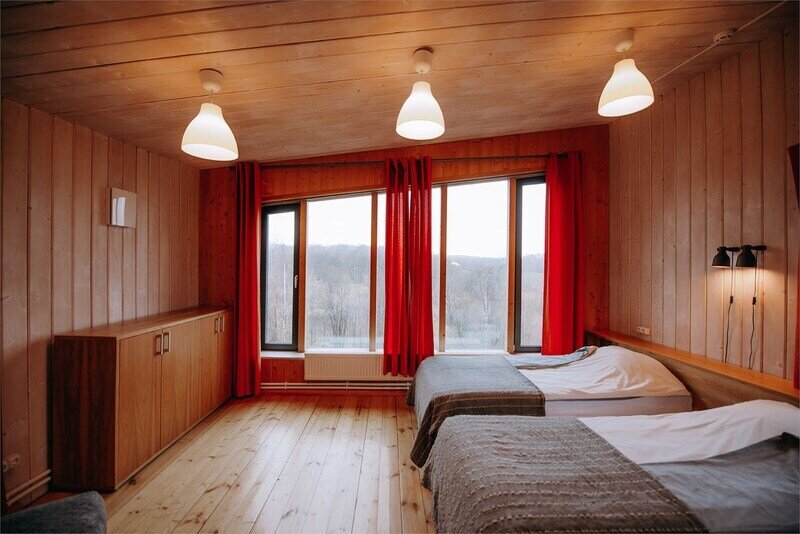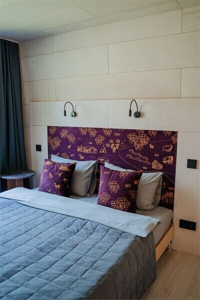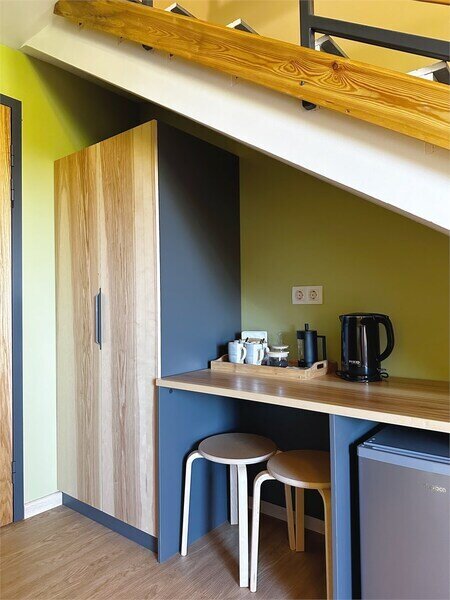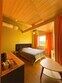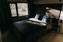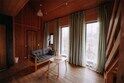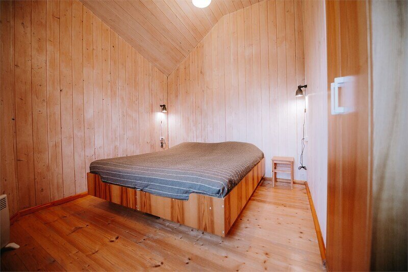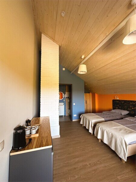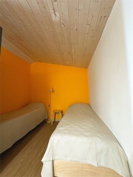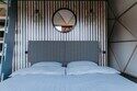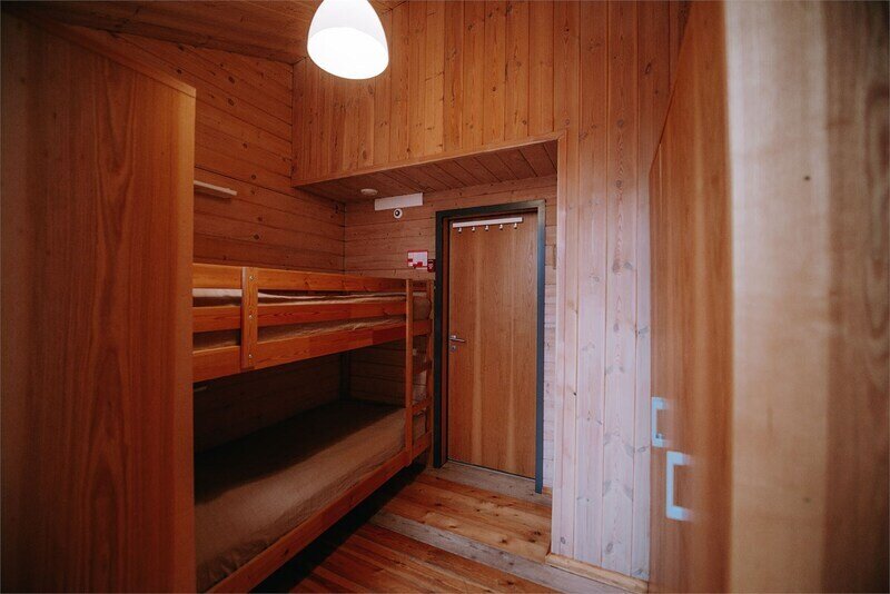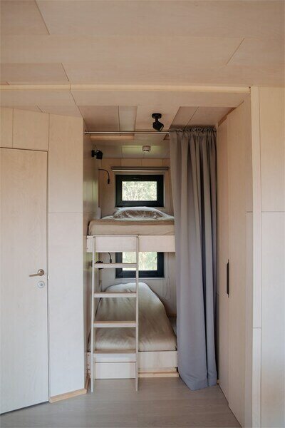 Стандартный номер на 4-х гостей имеет всего одну двуярусную кровать, отделенную шкафом-перегородкой от двух односпальных кроватей у мансардного окна. Все номера выполнены в дереве, имеют достаточно мест для размещения вещей во встроенных шкафах, у каждого спального места есть своя подсветка, полочка для подзарядки гаджетов.