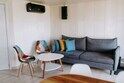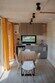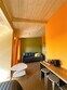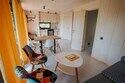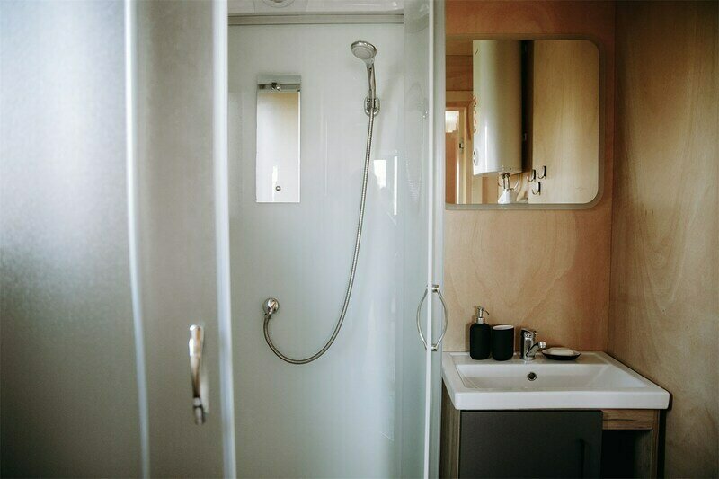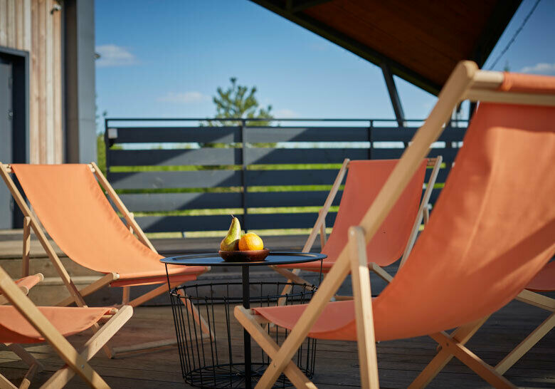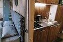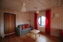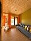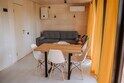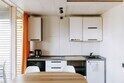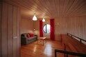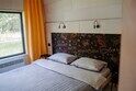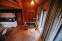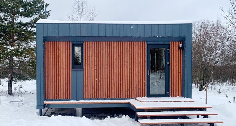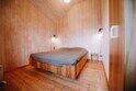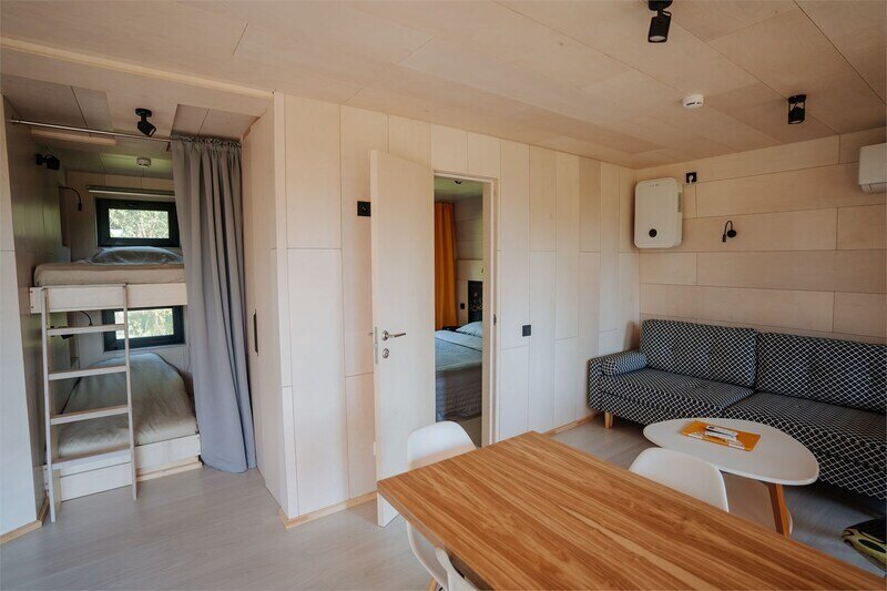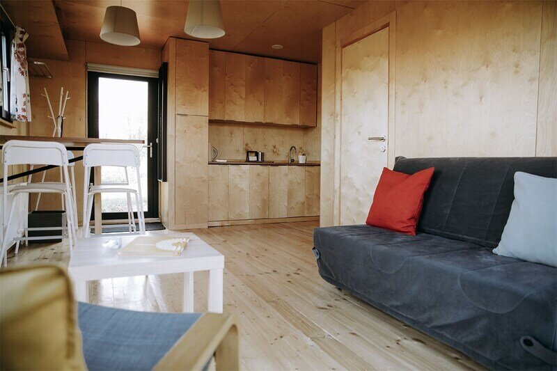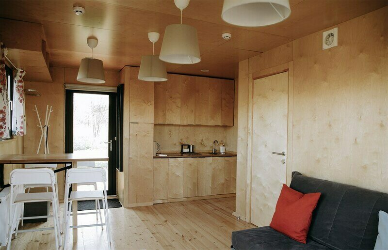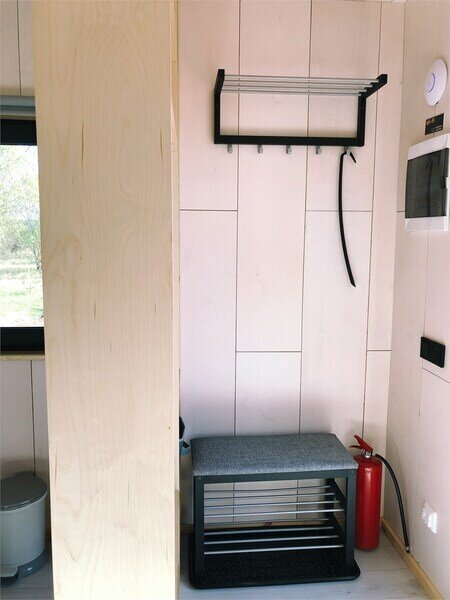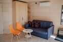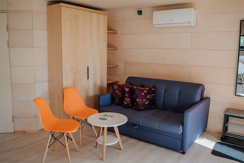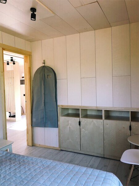 Одноэтажный компактный модульный дом с террасой имеет гостиную с оборудованной кухней, спальню, санузел с душем. В спальне - одна двуспальная кровать и большой шкаф для одежды. В зоне гостиной – диван на два спальных места и кресло. В доме есть утюг и гладильная доска.