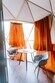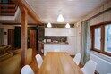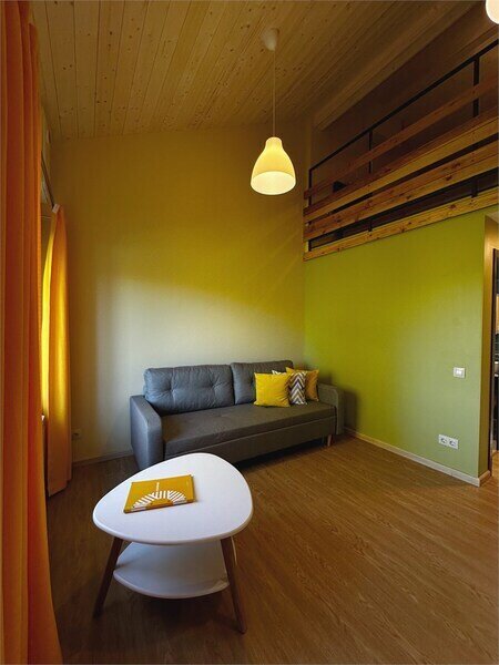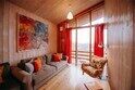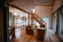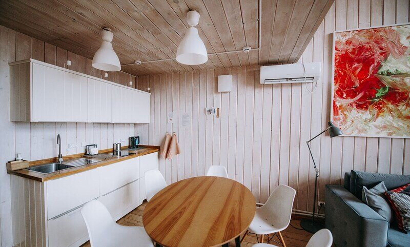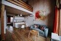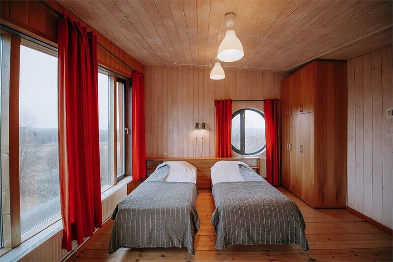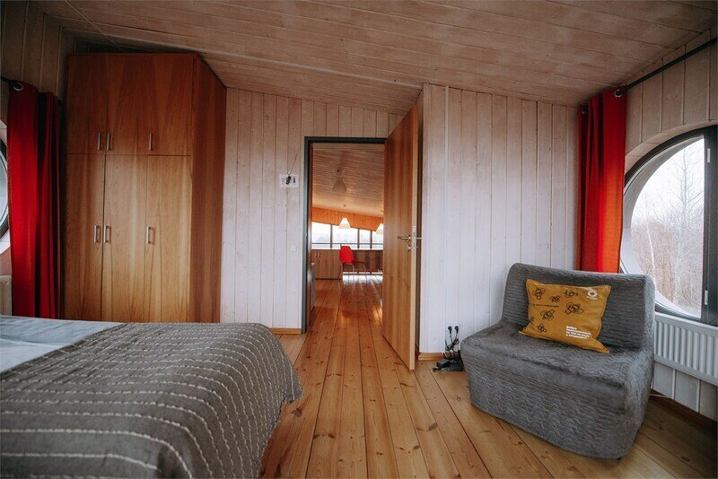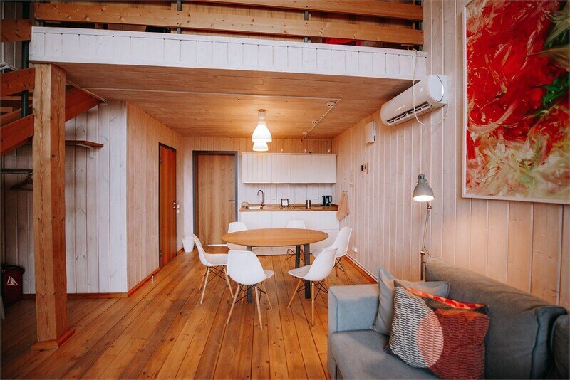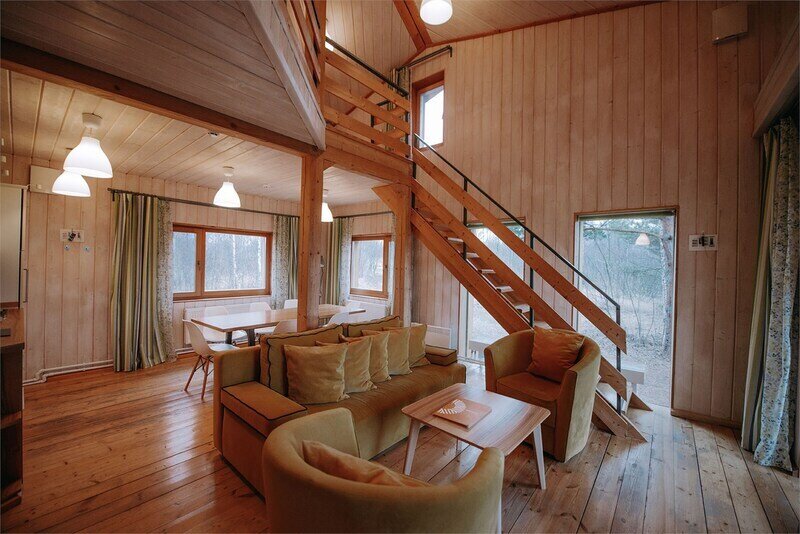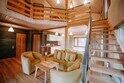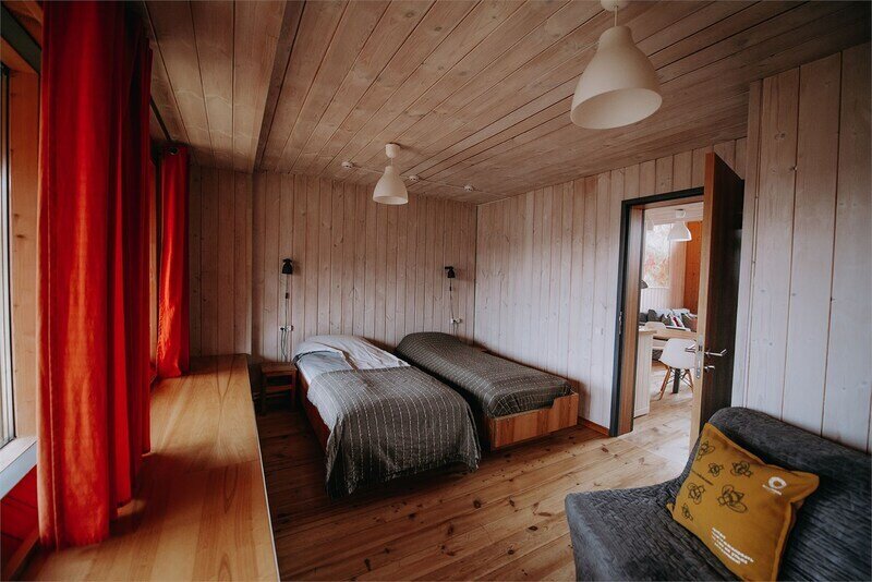 В каждом доме - гостиная с кухней и большим столом, а также две спальни. Одна из спален - с диваном-кроватью и креслом-кроватью- отгорожена трансформируемой стеной, что позволяет объединить пространство спальни и создать большую гостиную с панорамным окном. Вторая – отдельная спальня – допускает два варианта расстановки кроватей: две односпальные кровати или одна большая кровать.