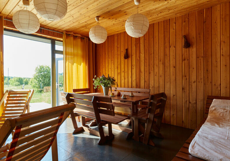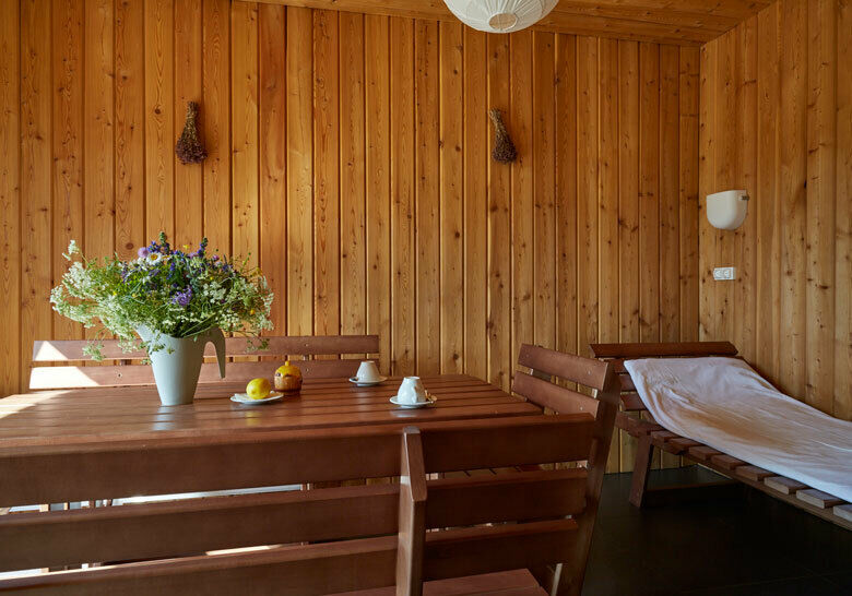 Кроме веников гости могут смешивать с горячей водой эфирные полезные масла и набрасывать их на деревянные стены в самой бане, создавая комфортный для каждого уровень влажности. Для каменки мы завариваем в медном ковшике специальный настой из трав, дающий целебный аромат. Советуем гостям париться при температуре 70-90 °C, не торопясь прогревая тело во влажном паре и не перегреваясь при этом.