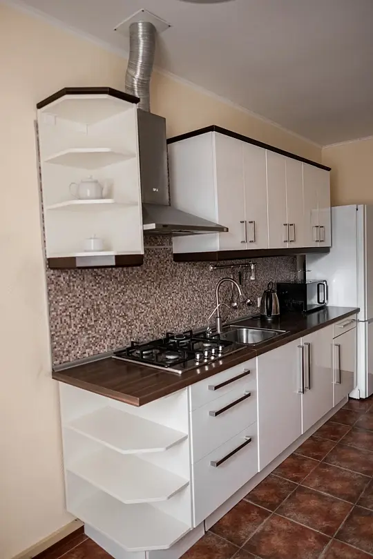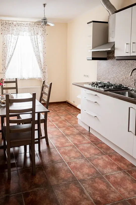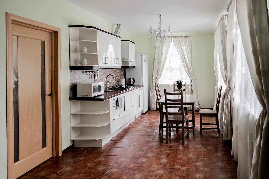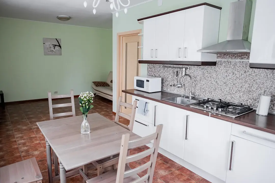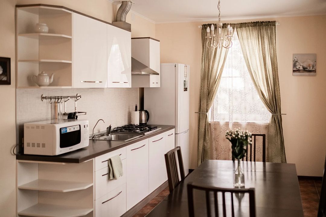 Кухня оборудована газовой плитой, холодильником, микроволновой печью, электрическим чайником, сервизом на 6 персон, вспомогательной посудой, полотенцами, салфетками.