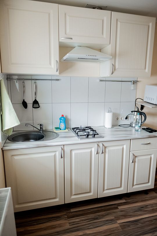 Кухня оборудована газовой плитой, холодильником, микроволновой печью, электрическим чайником, сервизом на 4 персоны, вспомогательной посудой, полотенцами, салфетками.
