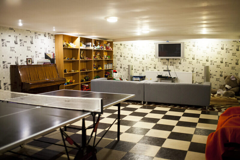 Цокольный этаж домика предлагает гостям разнообразные развлечения: бильярд, караоке, теннисный стол, пианино. Для занятий спортом доступны беговая дорожка и велотренажер. А также здесь обустроен детский уголок, где маленькие посетители могут весело провести время.