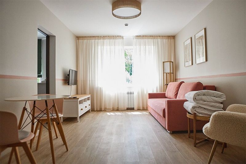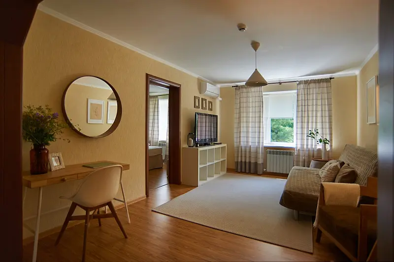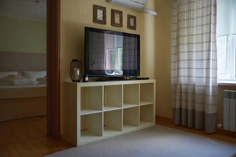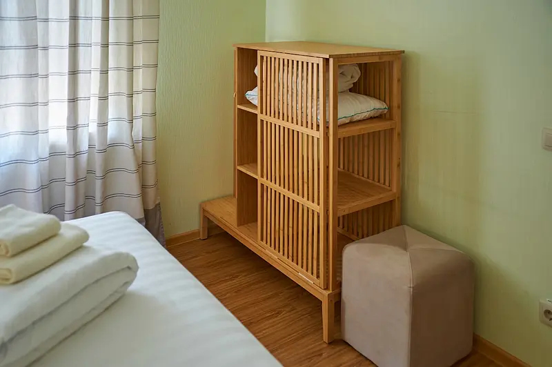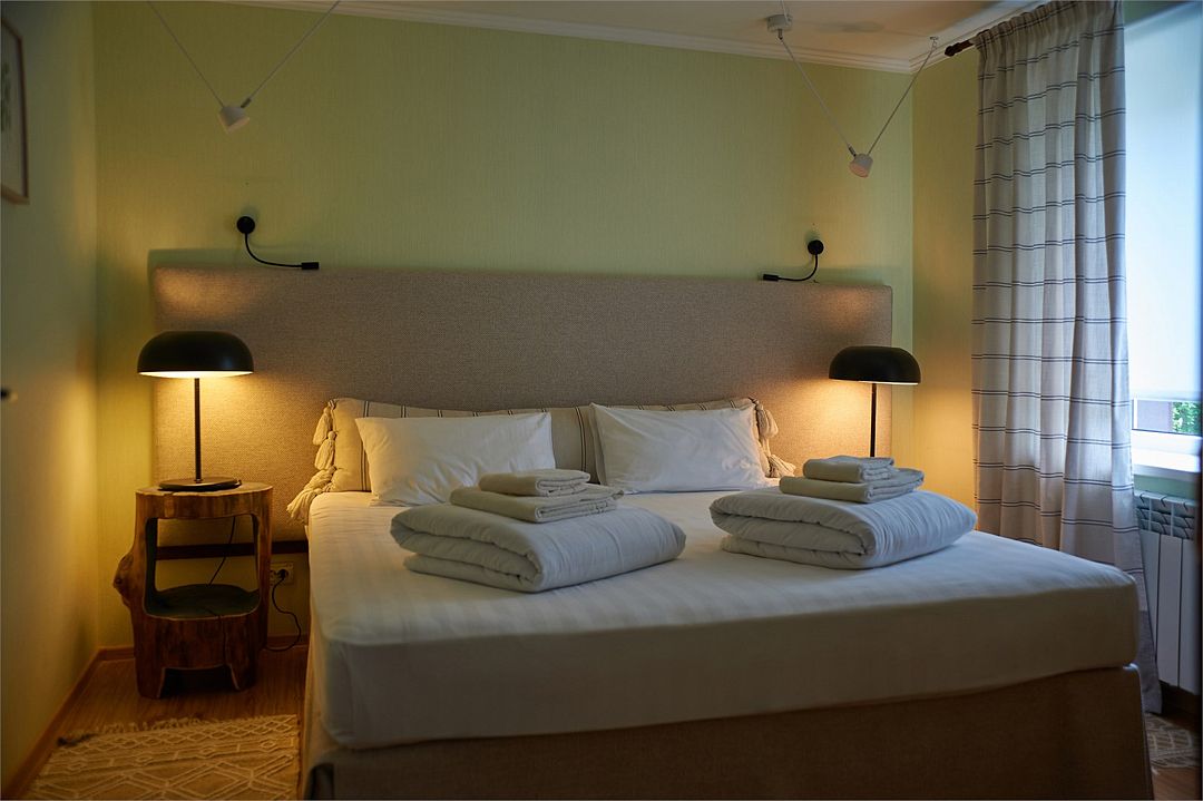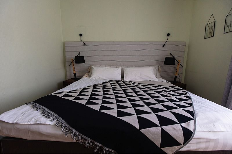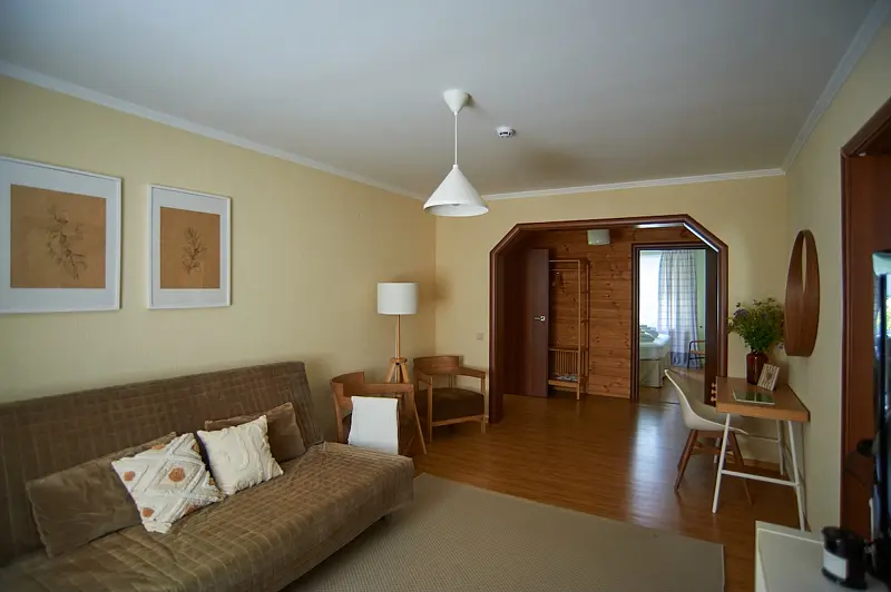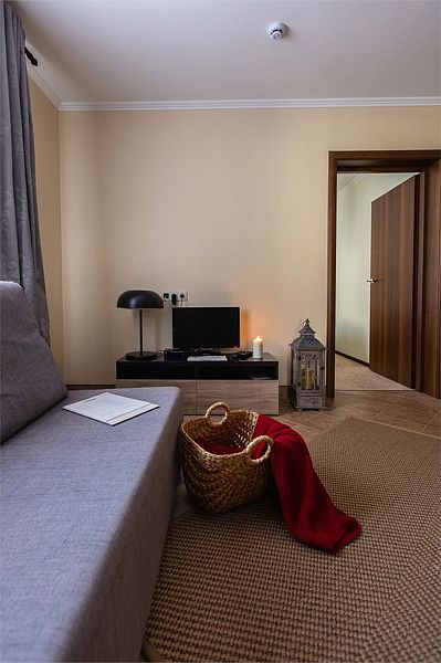 В номере — небольшая кухонная зона с чайником, СВЧ, посудой, холодильником, проходная гостиная с раскладывающимся диваном, спальня с двуспальной кроватью, просторный совмещенный санузел с душевой зоной.