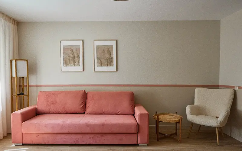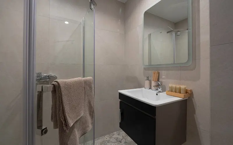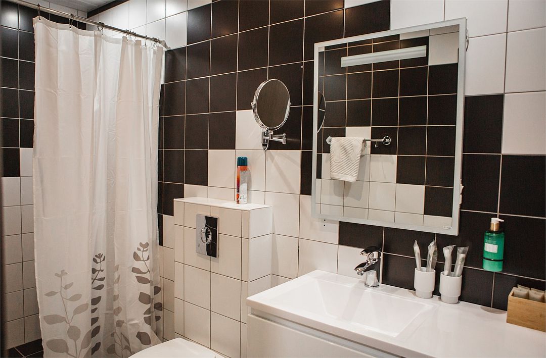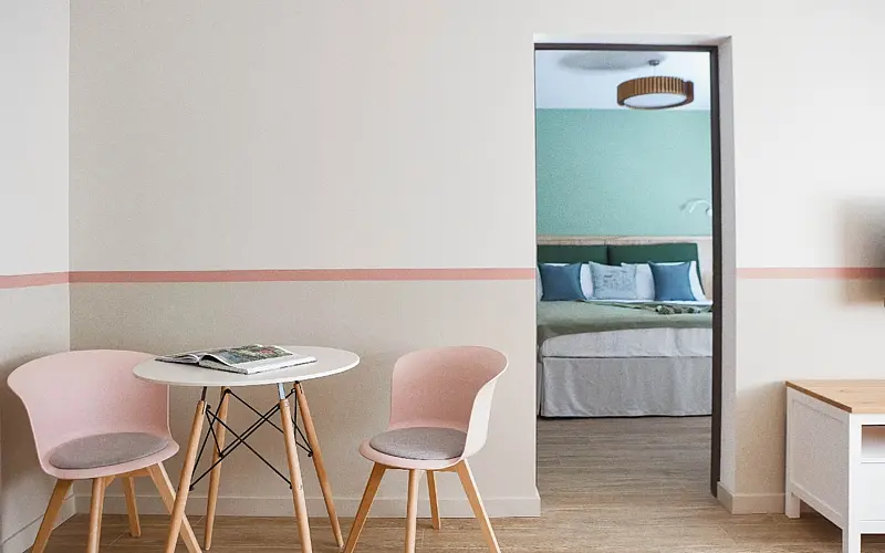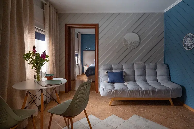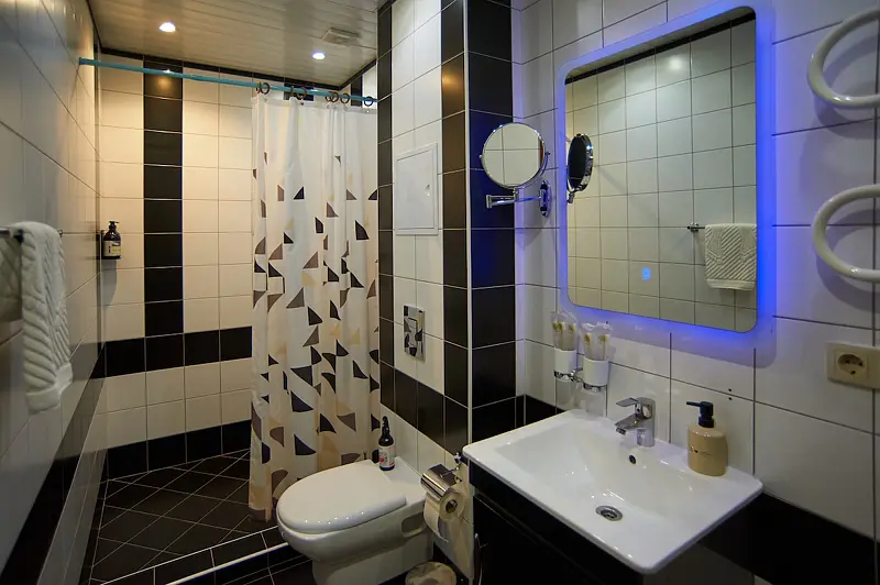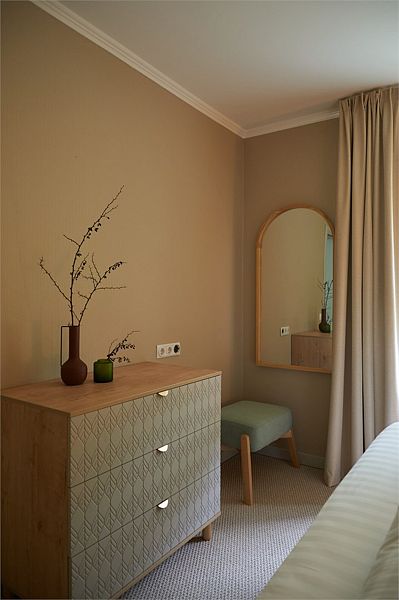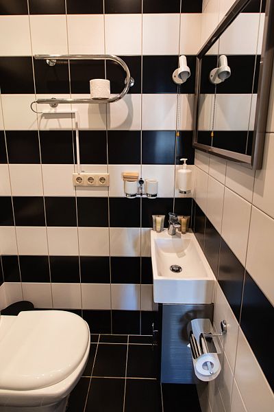 В номере — небольшая кухонная зона с чайником, СВЧ, посудой, холодильником, проходная гостиная с раскладывающимся диваном, спальня с двуспальной кроватью, просторный совмещенный санузел с душевой зоной.