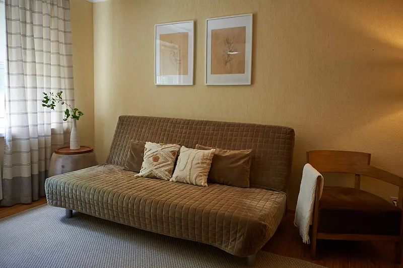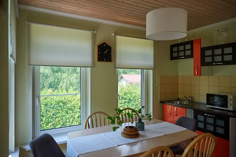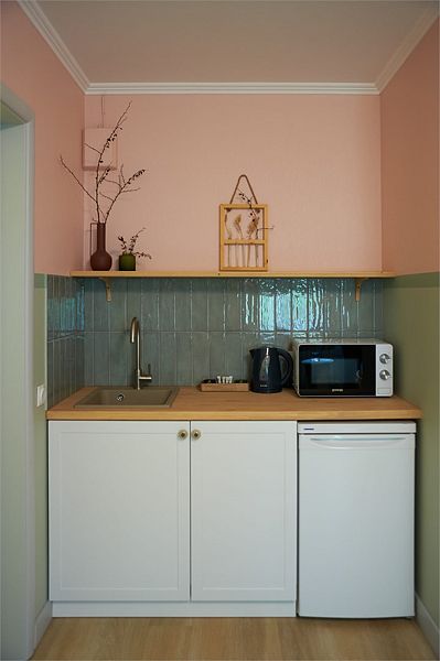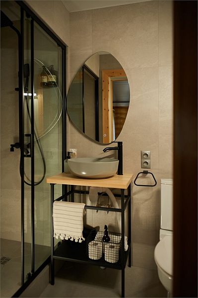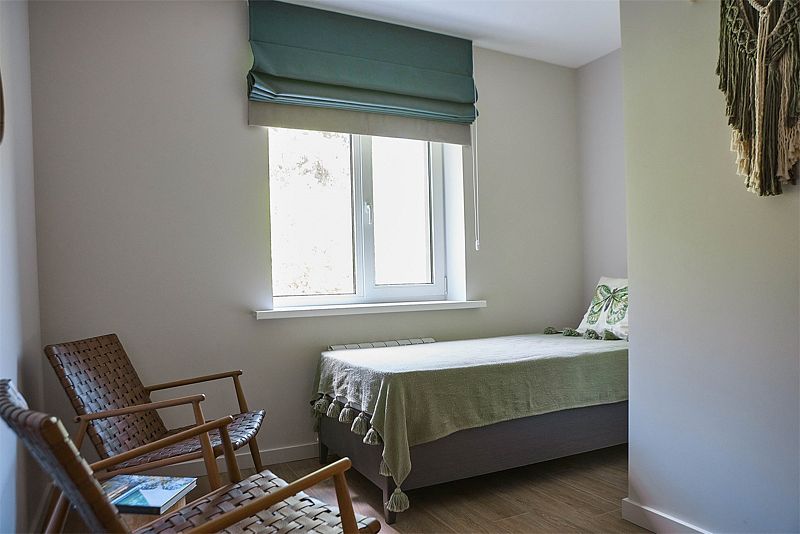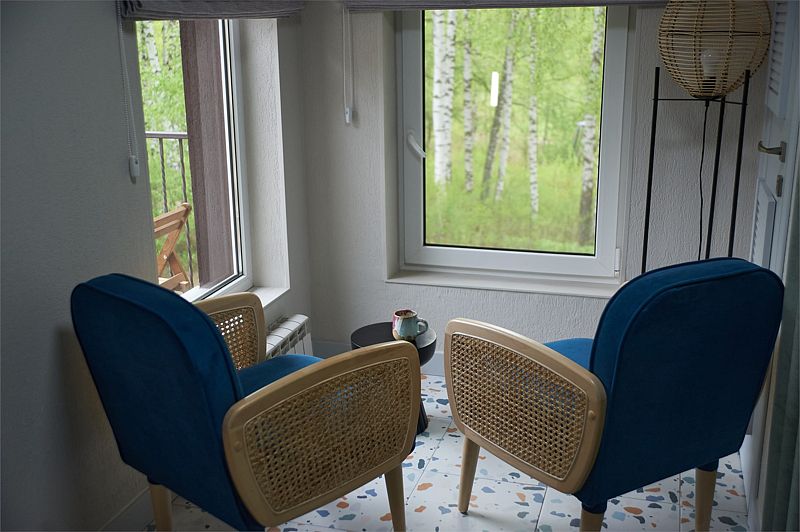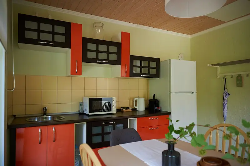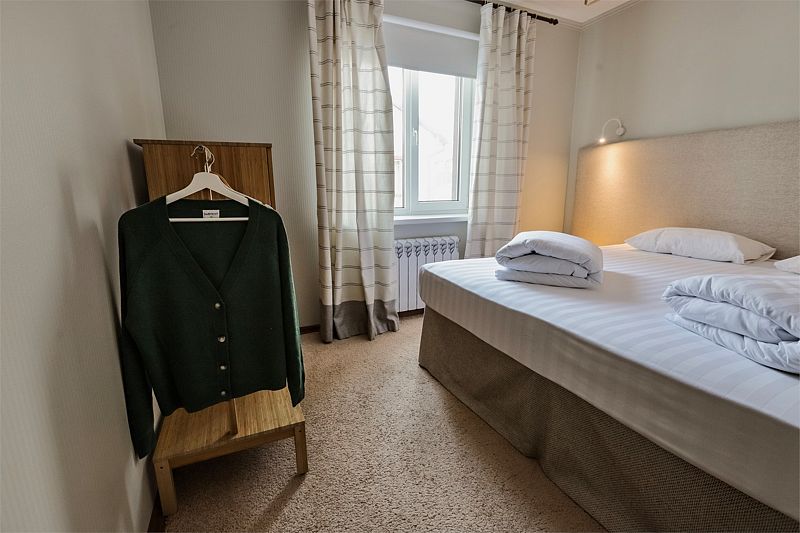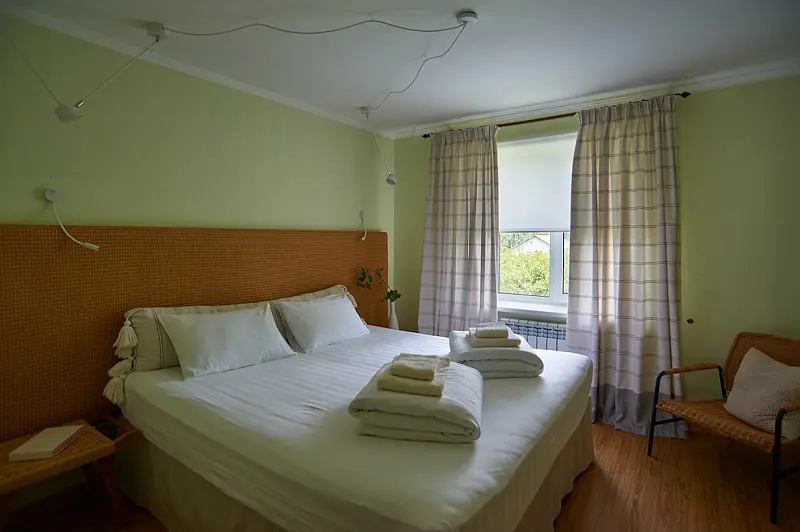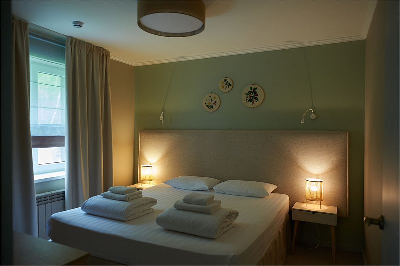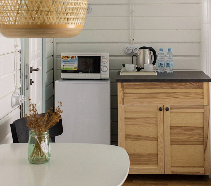В каждом доме – по два номера, объединенных общей стеной, но со своим отдельным входом и территорией перед домом с мангальной зоной. В номере - небольшая кухонная зона с чайником, СВЧ, посудой, холодильником, гостиная с раскладывающимся диваном, спальня с двуспальной кроватью, совмещенный санузел с душевой кабиной. Вход в туалетную комнату из спальни.