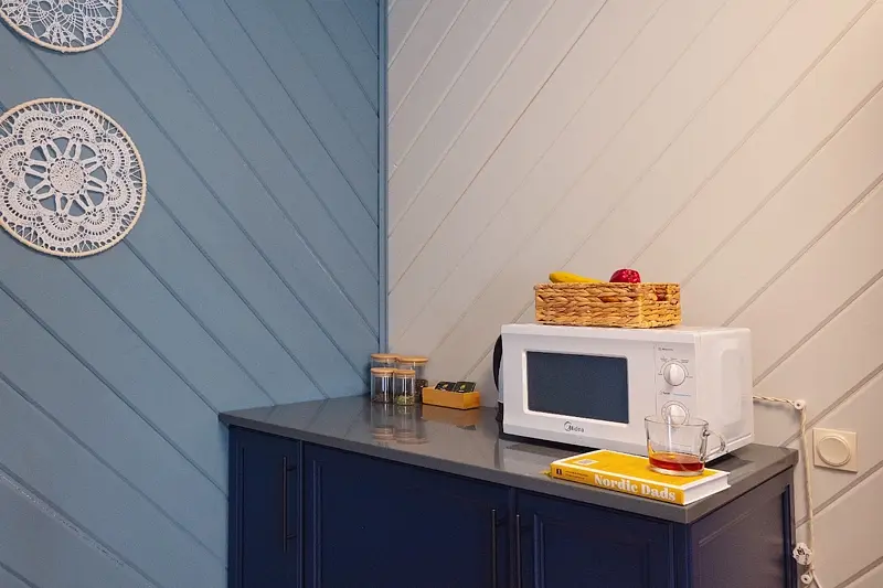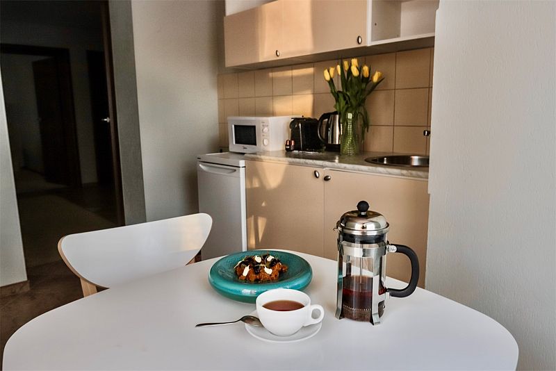 Хороший матрас, пушистые полотенца, мыло, шампунь, гель для душа приятные. Предусмотрена вся посуда в номере, чайник, кофеварка, холодильник.