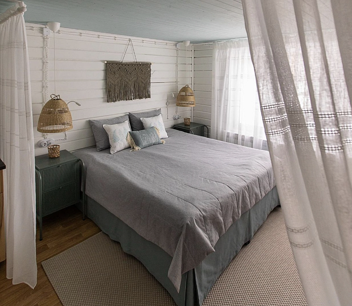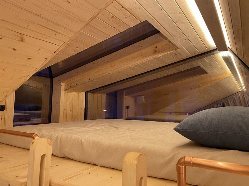 Внутри очень уютно. Каждый домик очень функционален и эргономичен. В нем комфортно расположились двуспальная кровать, обеденный стол, небольшой кухонный уголок (чайник, холодильник), ванная комната. Под мансардным окном еще одно спальное место, шириной 140 см. Можно лежать вдвоем и любоваться небом, или же здесь может разместиться третий гость - взрослый или ребенок