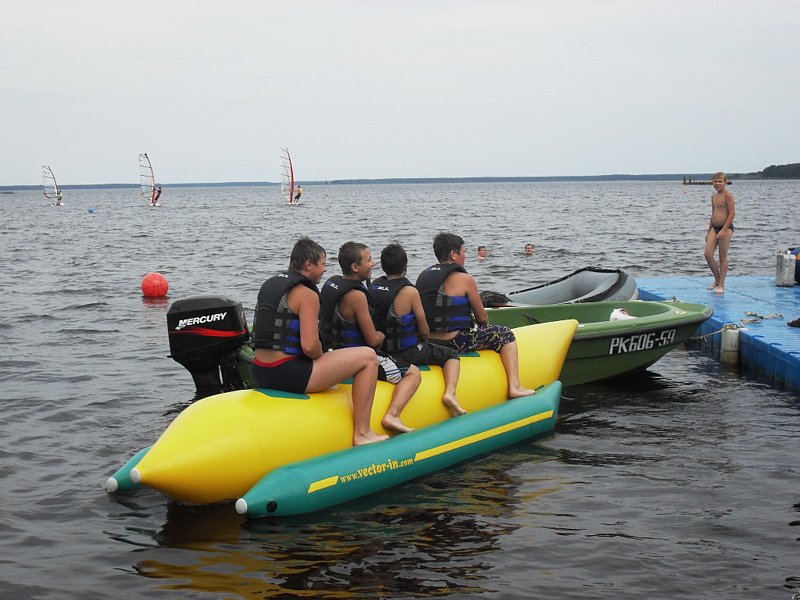 Прибрежное мелководье очищено и оборудовано надежными понтонами, которые особенно нравятся маленьким гостям. Те, кто постарше, непременно захотят кататься на «банане», «ватрушке», на водных лыжах или покрутиться в большом шаре, устанавливаемом прямо на воду. Удовольствия получается не меньше чем на море.
