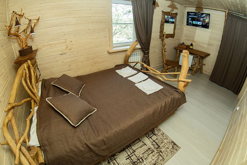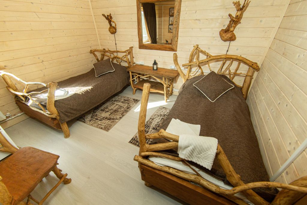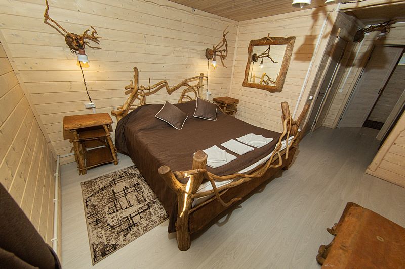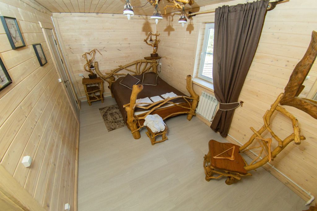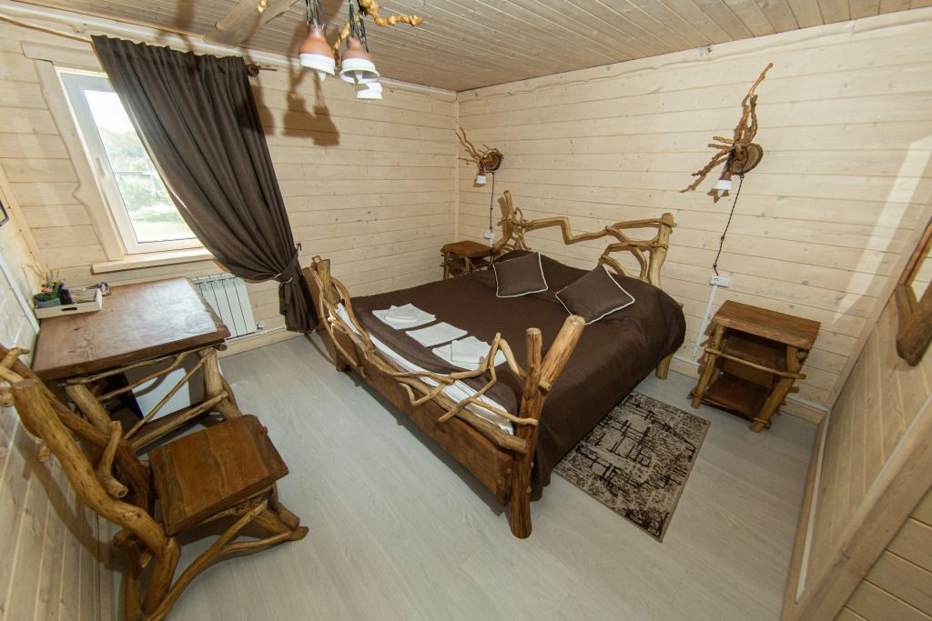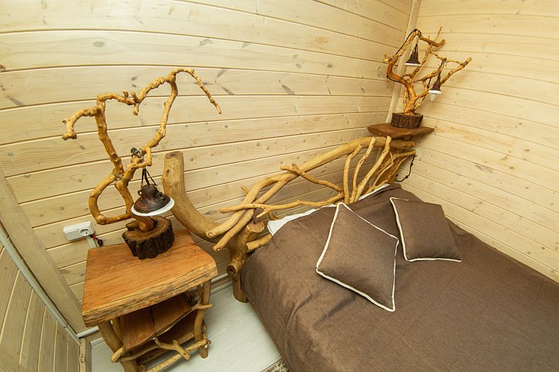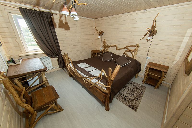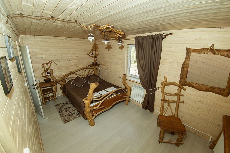 Жилое и общее пространство корпуса оформлено в стиле «Рустик»: массивные дубовые столы, замысловатые стулья и табуреты, плетеная проводка и изголовья кроватей из переплетающихся ветвей. Вся мебель сделана в единственном экземпляре специально для «Агроусадьбы».