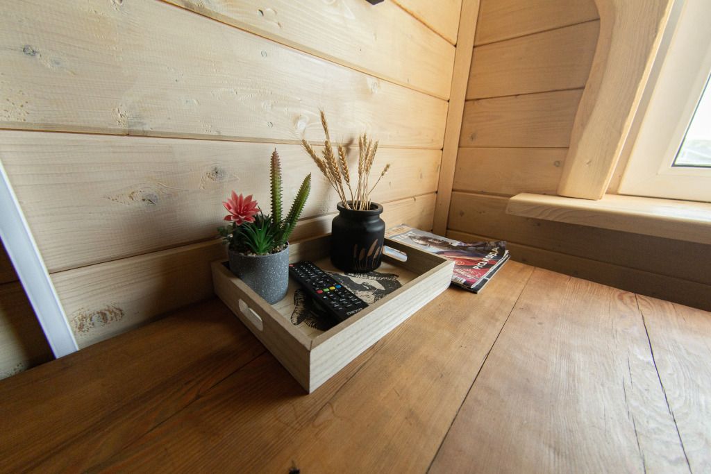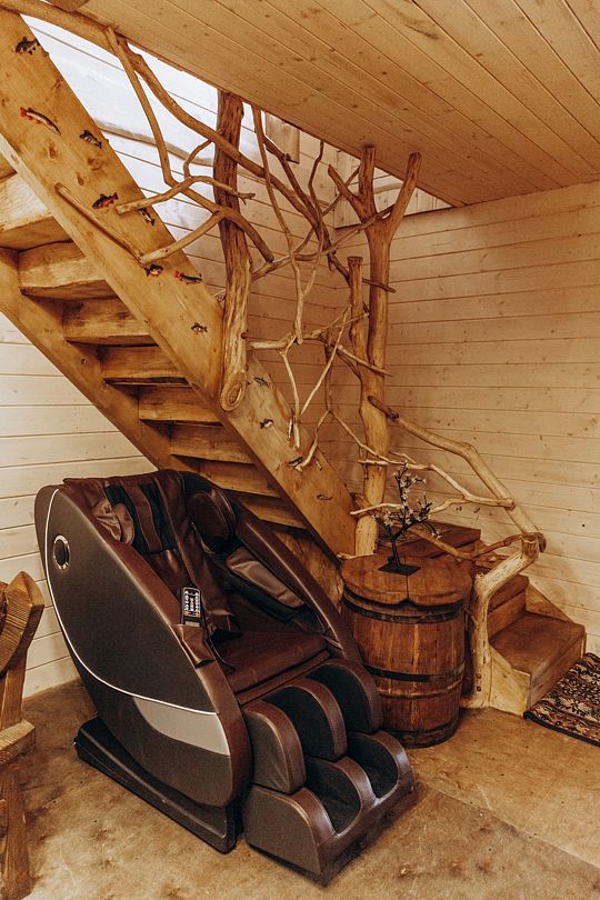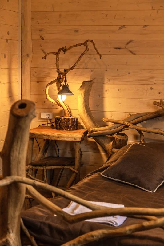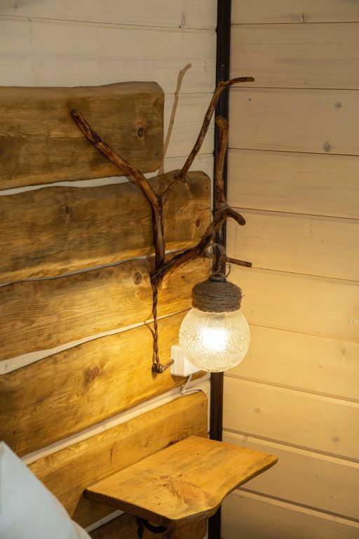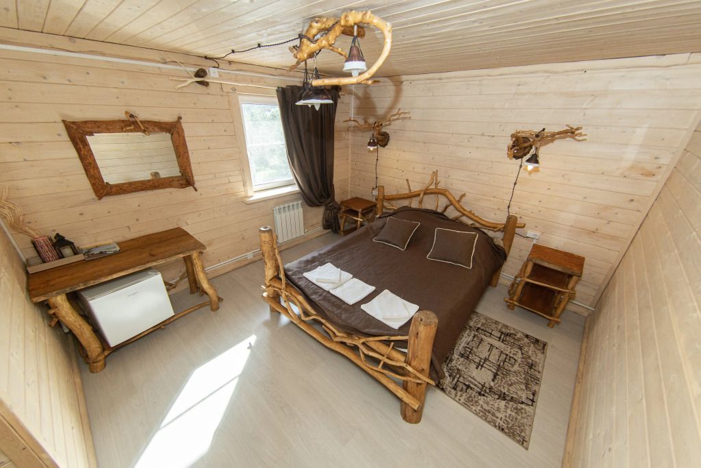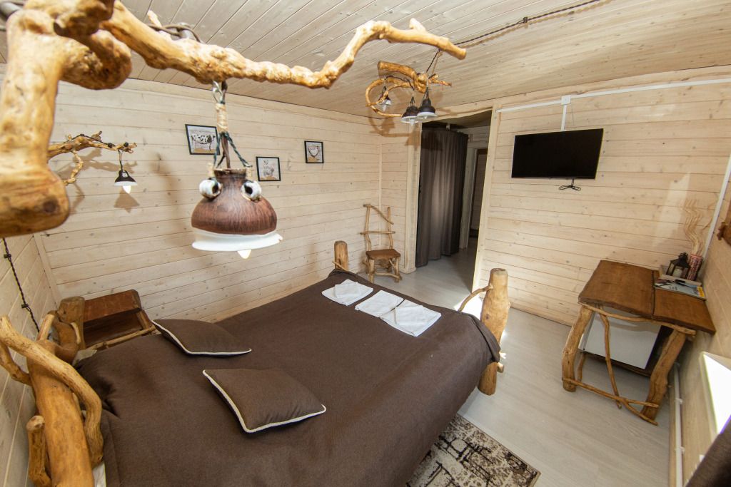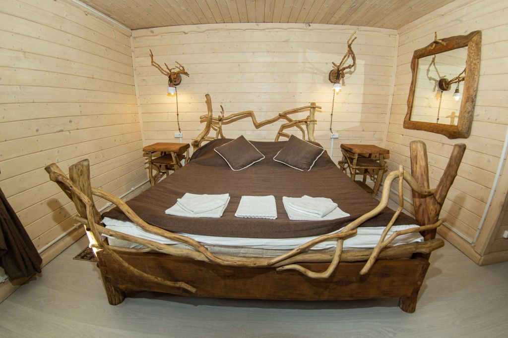 Жилое и общее пространство корпуса оформлено в стиле «Рустик»: массивные дубовые столы, замысловатые стулья и табуреты, плетеная проводка и изголовья кроватей из переплетающихся ветвей. Вся мебель сделана в единственном экземпляре специально для «Агроусадьбы».