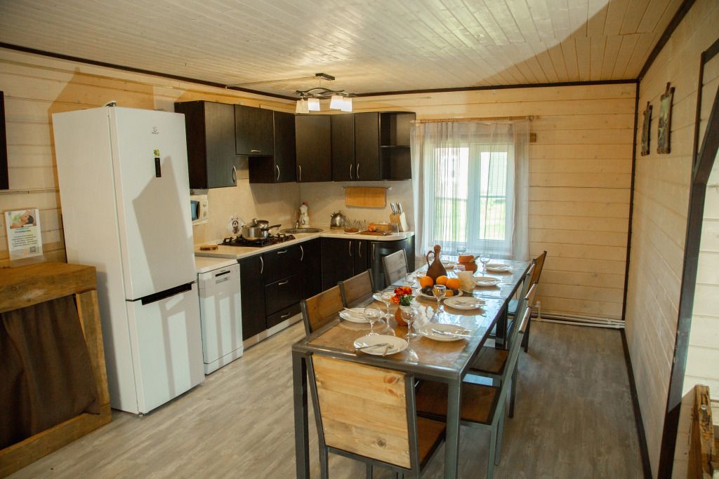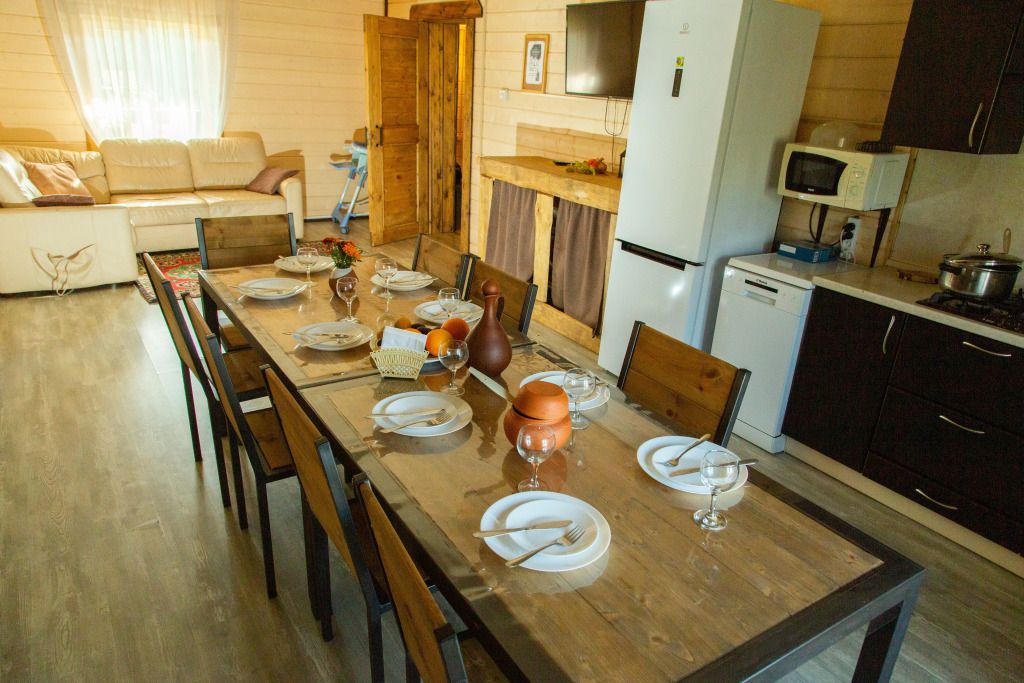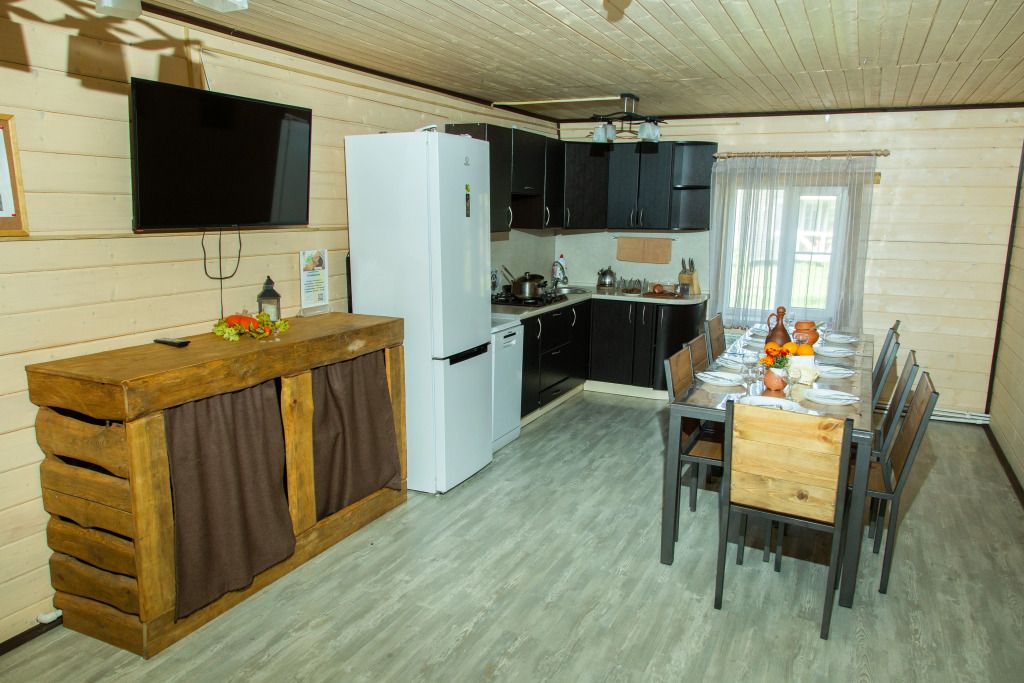 Дом расположен прямо у зарыбленного пруда. Просторная кухня оборудована всем необходимым, включая посудомоечную машину. Созданы все условия для отдыха с детьми: есть стульчик для кормления малышей и детская кроватка. У дома собственная мангальная зона и атмосферные качели на берегу пруда