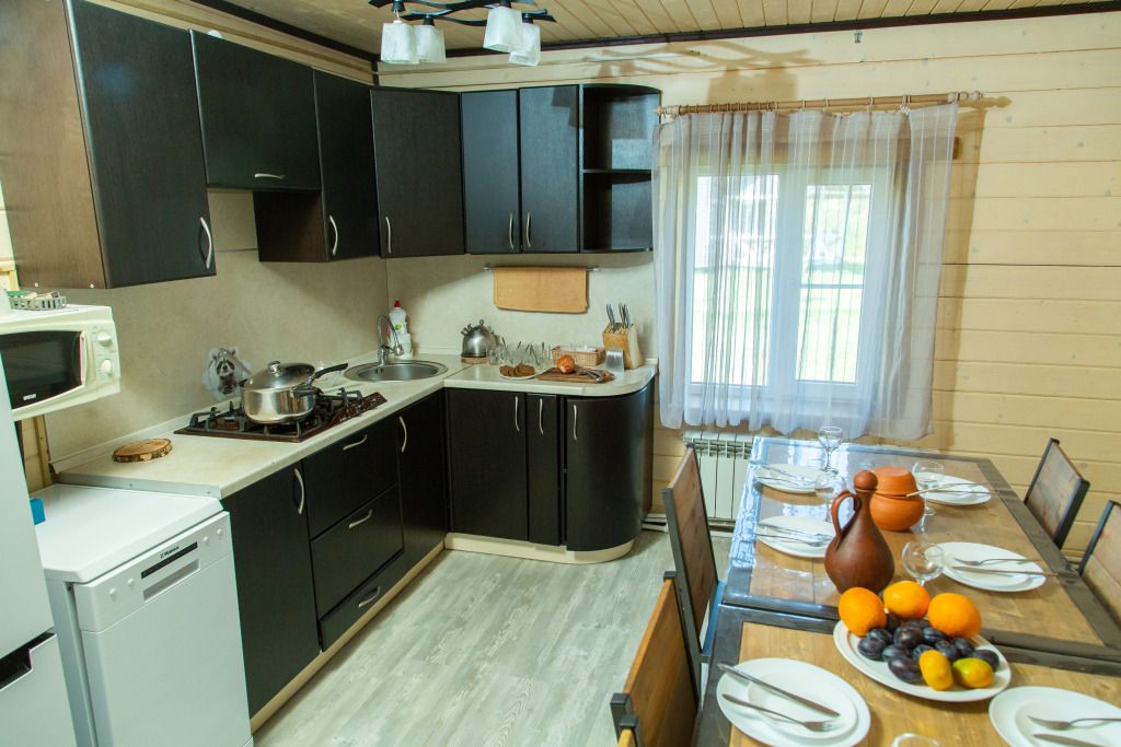 Кухни коттеджей полностью оборудованы, на них есть все для готовки. Холодильники, газовые печи, посудомойки, кастрюли, сковородки и полные наборы посуды. Кроме того, есть детские стульчики для кормления.