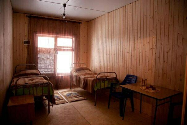 умывальники, душевые, туалеты и стиральная машина в отдельно стоящем здании на территории базы.