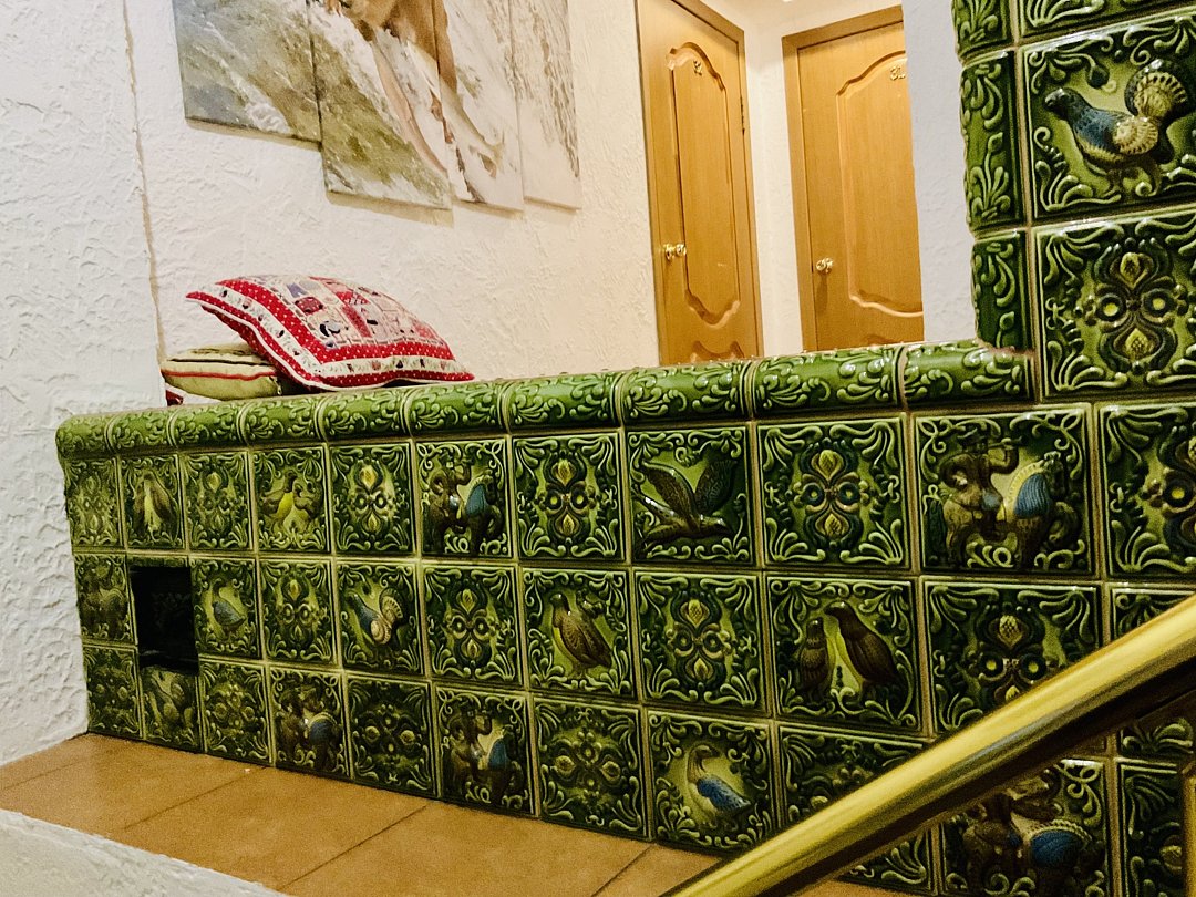 Это самый большой в России действующий изразцовый ансамбль «Русская печь». В самой печи готовят русские блюда: щи, уху, супы, каши, холодец, запечённого молочного поросёнка или гуся, а также буженину, рыбные и мясные пироги расстегаи, которые получаются очень вкусными и отличаются от тех, которые готовят на плитах.