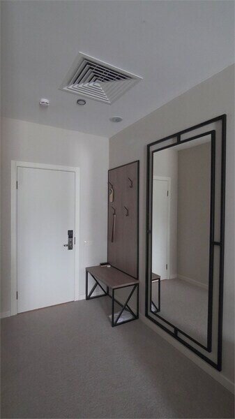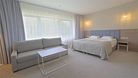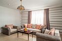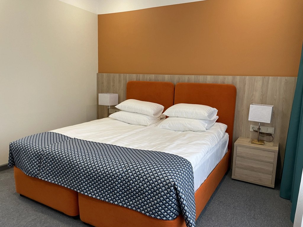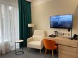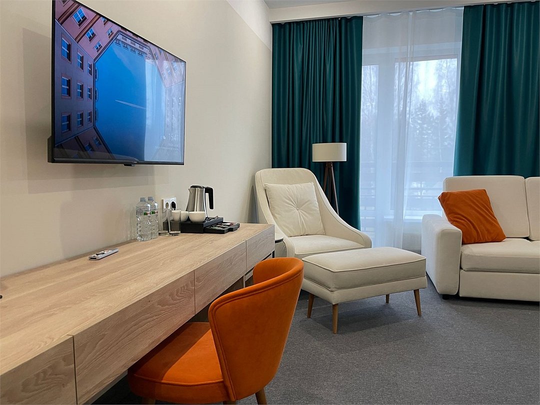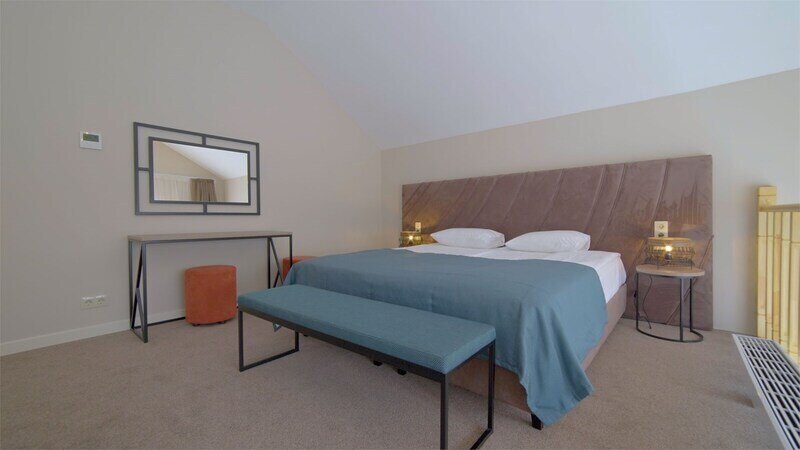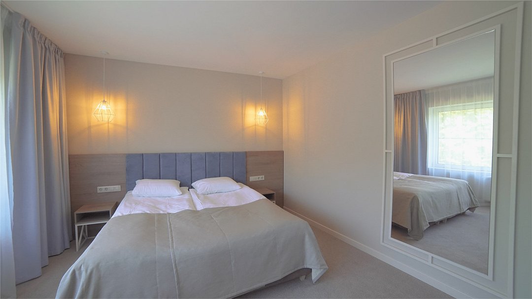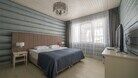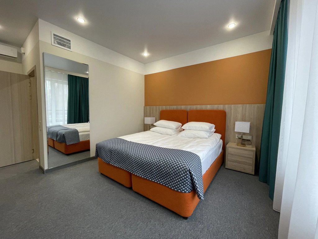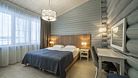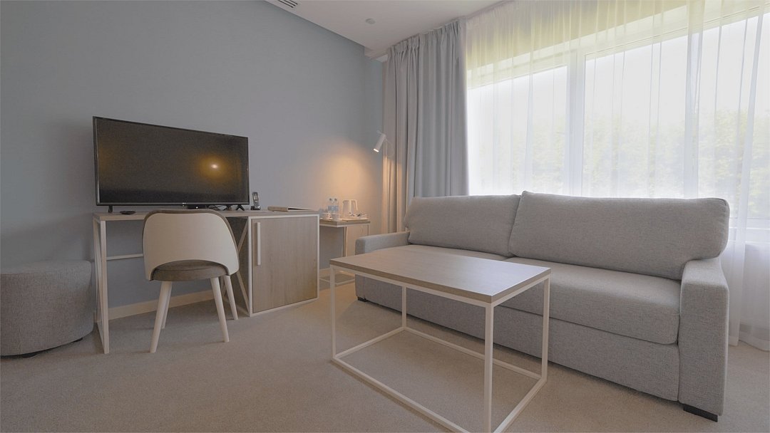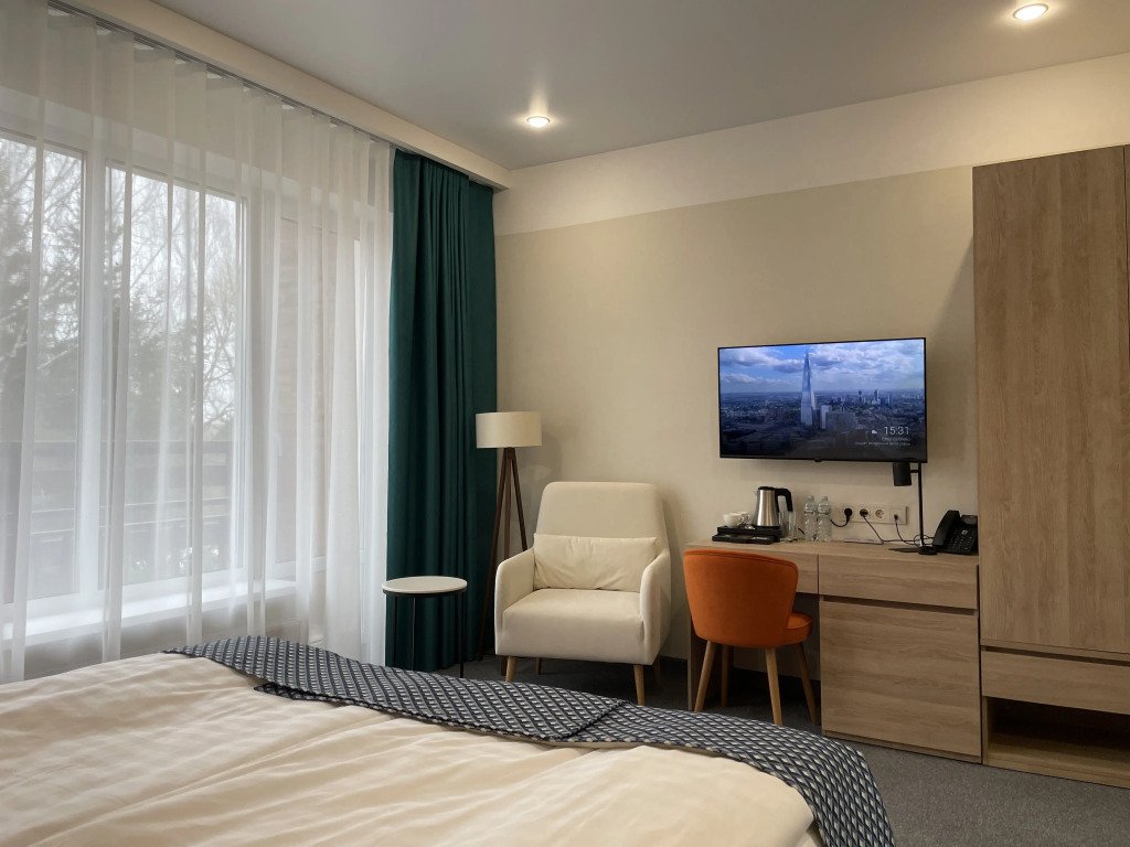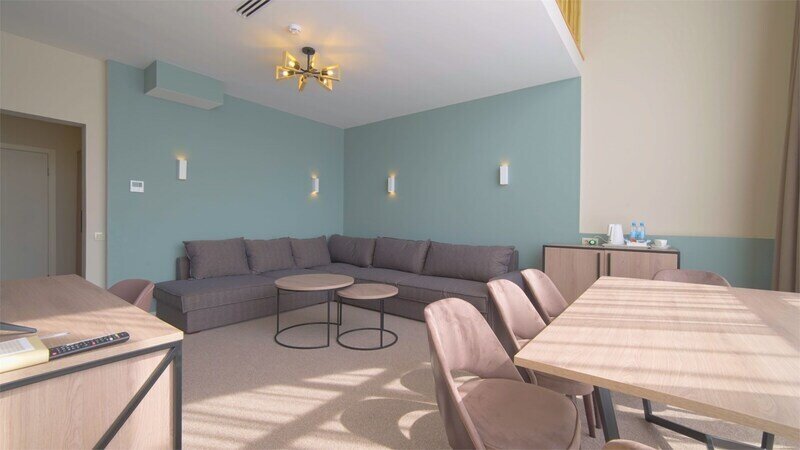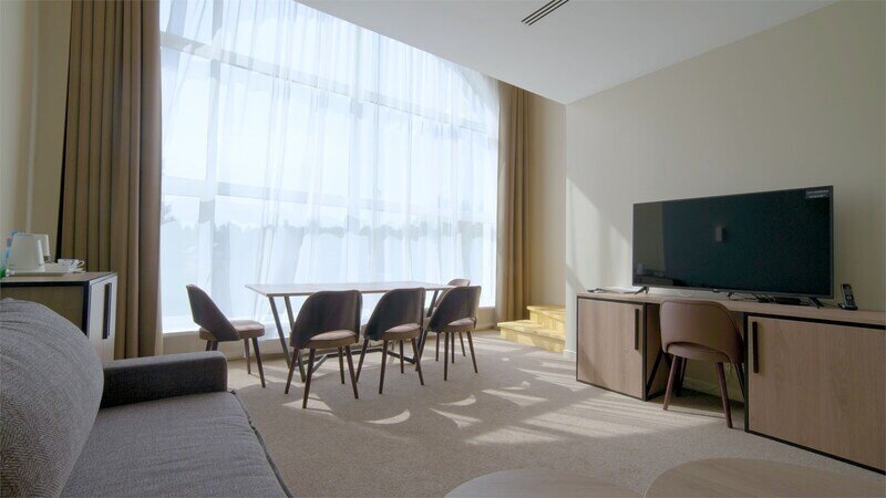 Номер оформлен в современном стиле с мягкой цветовой гаммой и акцентными элементами. Интерьер просторный, полон естественного света благодаря просторным окнам.