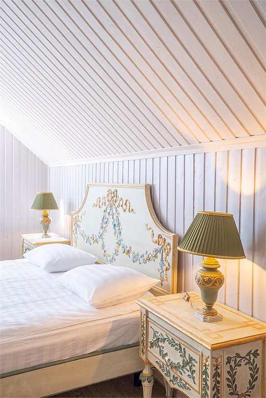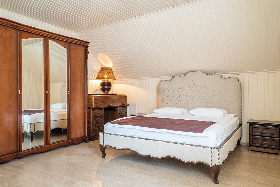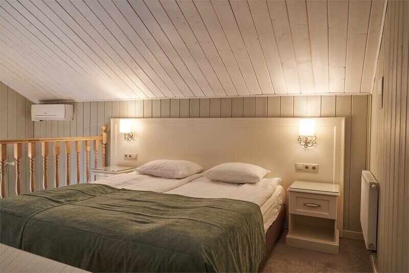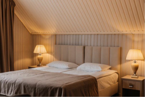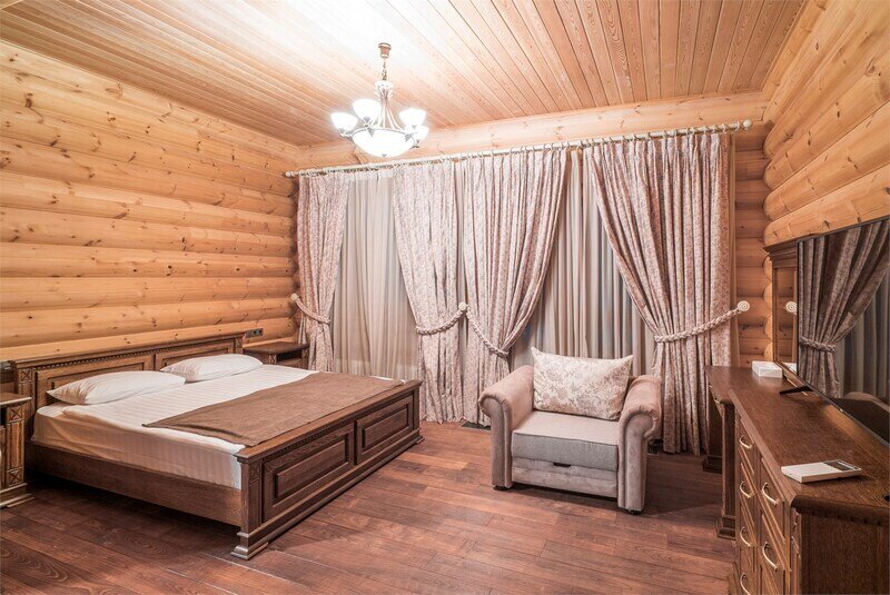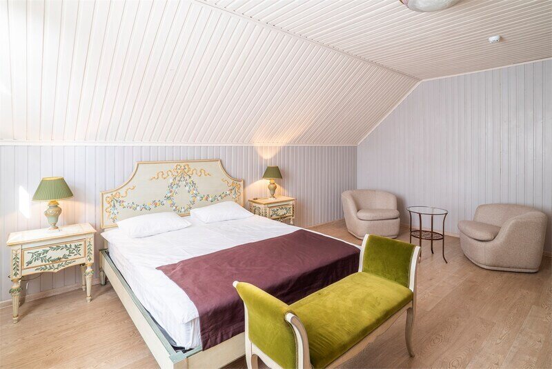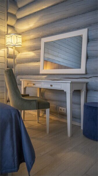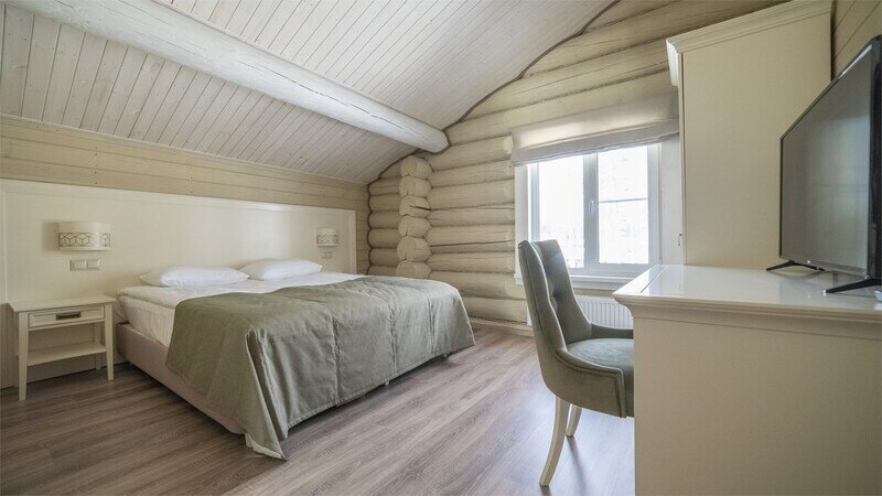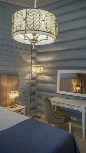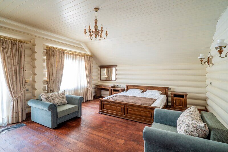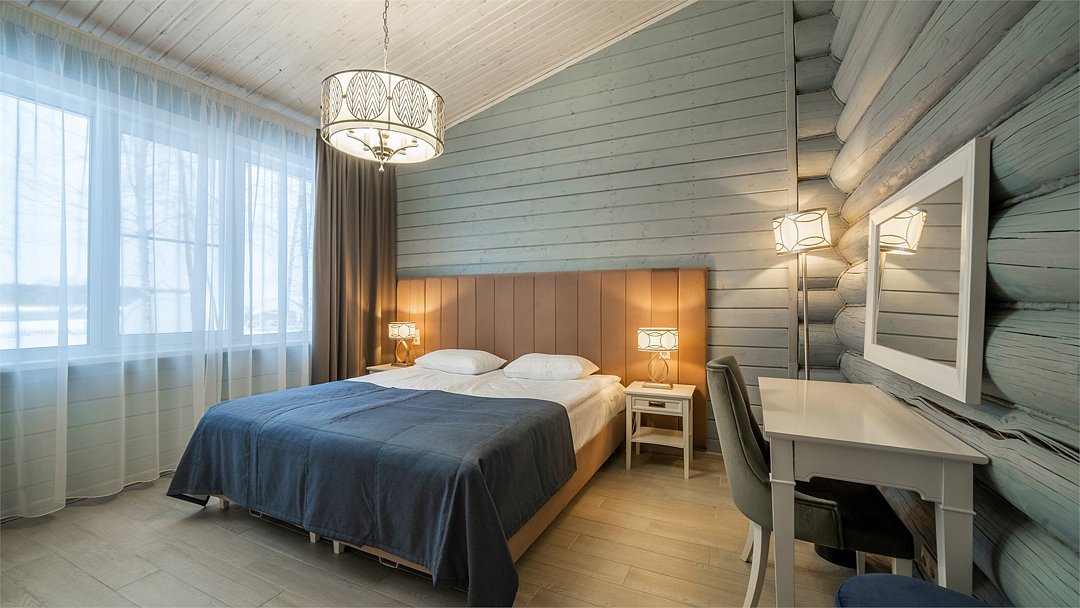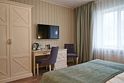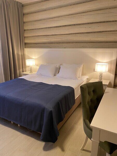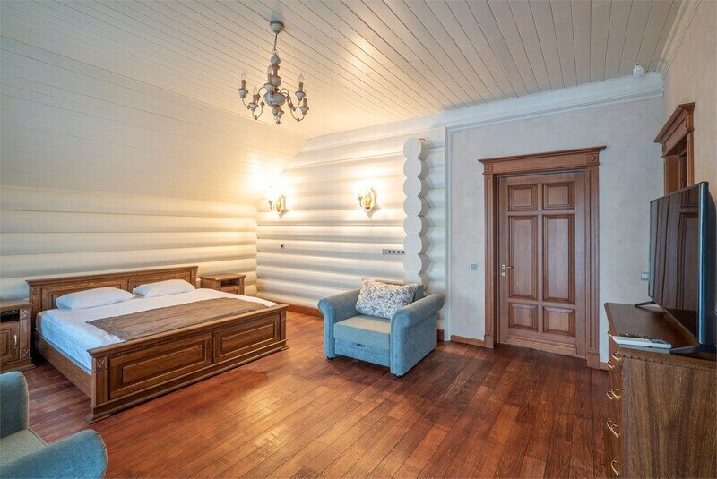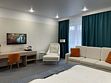 Большая двуспальная кровать дополняется уютными креслами и удобными тумбочками. К услугам гостей рабочая зона с письменным столом, что идеально подходит для деловых поездок или работы на удаленке.