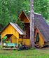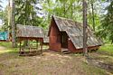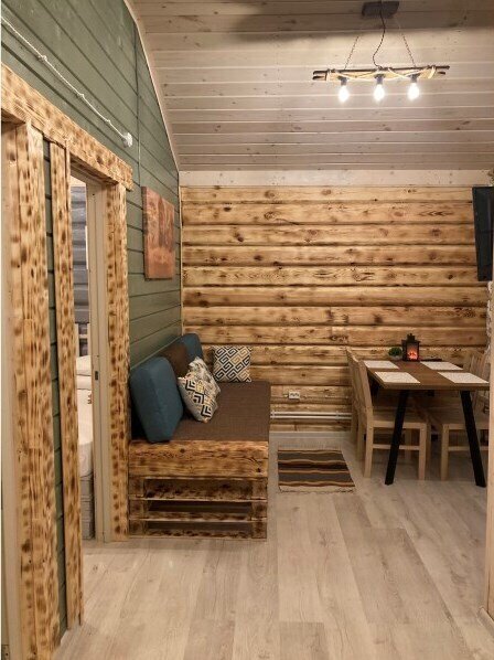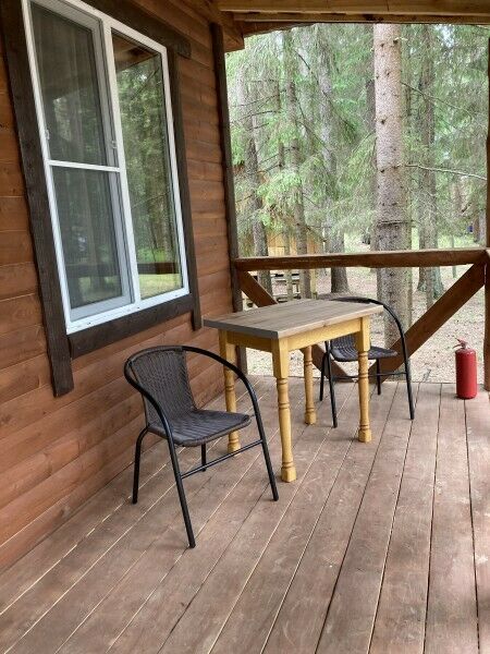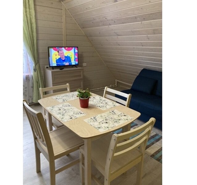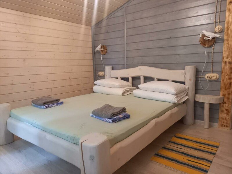 Домик для проживания до четырех гостей. Он оснащен двумя спальнями, в каждой по две односпальной кровати. Есть обеденная зона, холодильник, газовая плита, кухонные принадлежности. Около домика своя беседка. Санузел, душ в отдельно стоящем здании. Возможно проживание с домашними животными. В непосредственной близости от домиков находятся зоны с летним водопроводом, где можно умыться, и помыть посуду. Возможно предоставления дополнительного места( раскладушка или детская кроватка) за дополнительную плату.