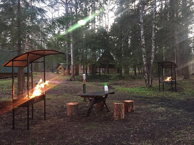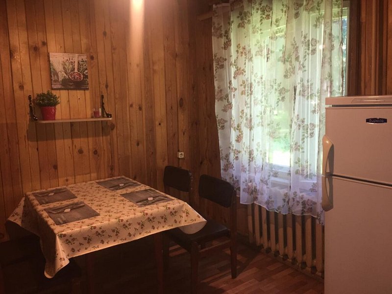 Кухня—- газовая плита, посуда. Собственный туалет. Душ общий, в отдельно стоящем здании. Собственная беседка.