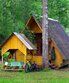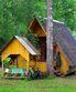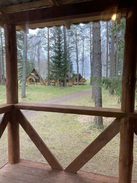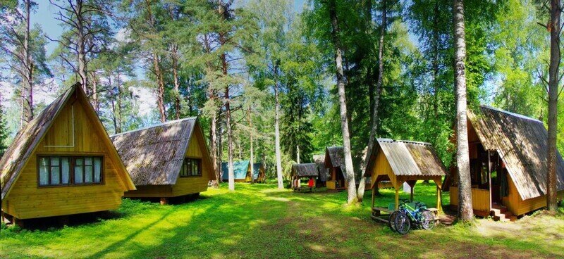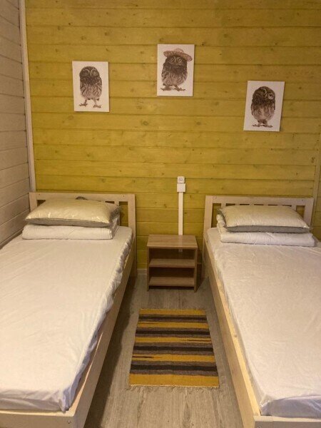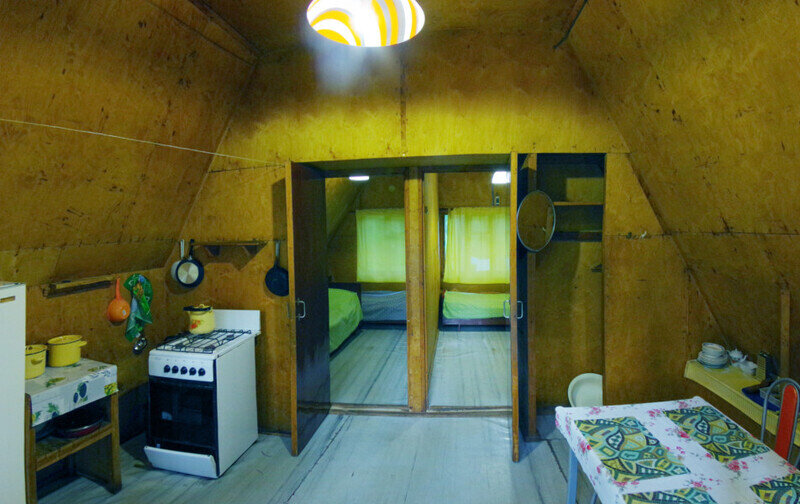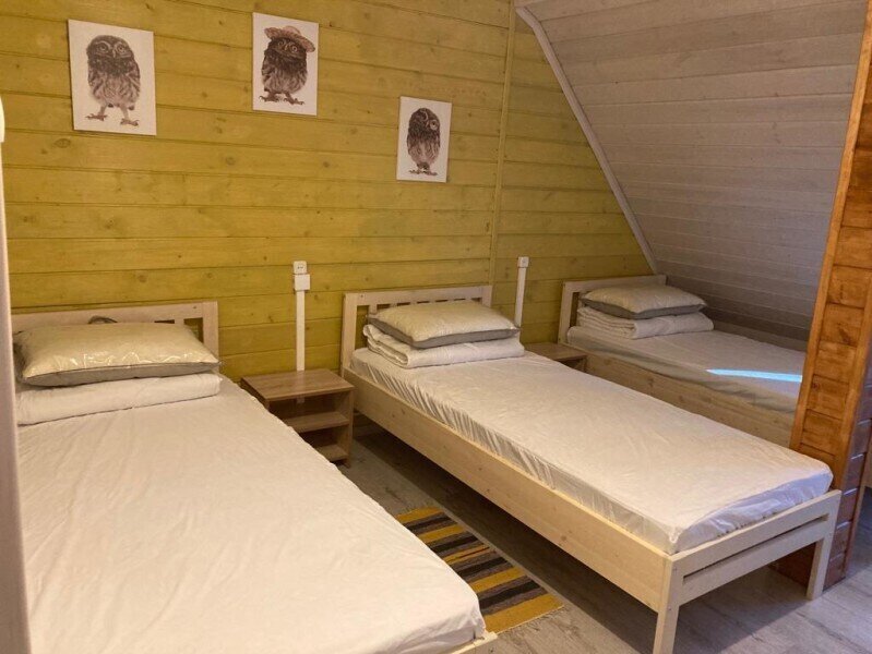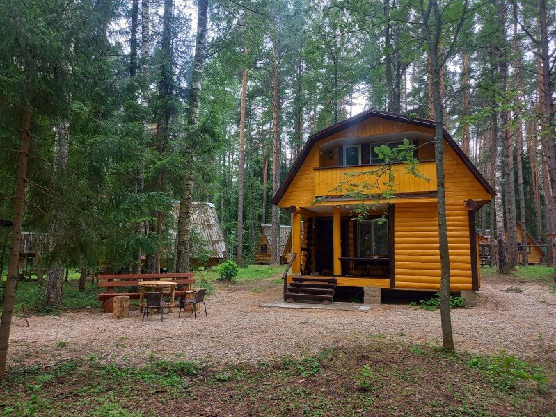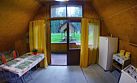 Домик для проживания до трех гостей. Он оснащен спальней с тремя односпальными кроватями. Есть обеденная зона, холодильник, газовая плита, кухонные принадлежности. Около домика своя беседка. Санузел, душ в отдельно стоящем здании. Возможно проживание с домашними животными. В непосредственной близости от домиков находятся зоны с летним водопроводом, где можно умыться, и помыть посуду. Возможно предоставление детской кроватки за дополнительную плату.