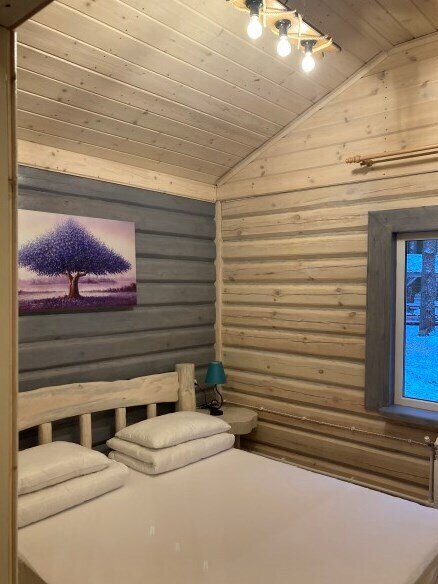 Домик для проживания до двух гостей. Он оснащен спальней с двумя односпальными кроватями. Есть обеденная зона, холодильник, газовая плита, кухонные принадлежности. Около домика своя беседка. Санузел, душ в отдельно стоящем здании. Возможно проживание с домашними животными. В непосредственной близости от домиков находятся зоны с летним водопроводом, где можно умыться, и помыть посуду. Возможно предоставление детской кроватки за дополнительную плату.