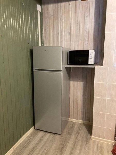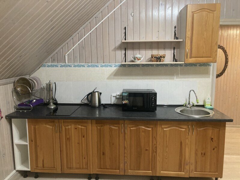 Кухня — холодильник, двухкомфорочная электрическая варочная панель, микроволновая печь, электрический чайник, посуда.