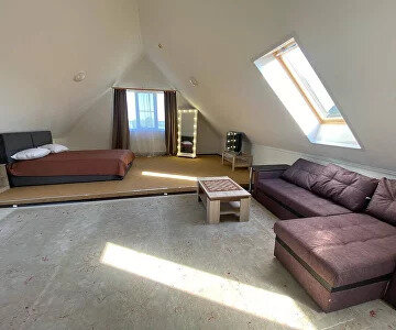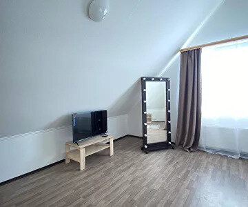 Номер студия с двуспальной кроватью плюс диван. В номере телевизор, чайник, сан узел , холодильник.