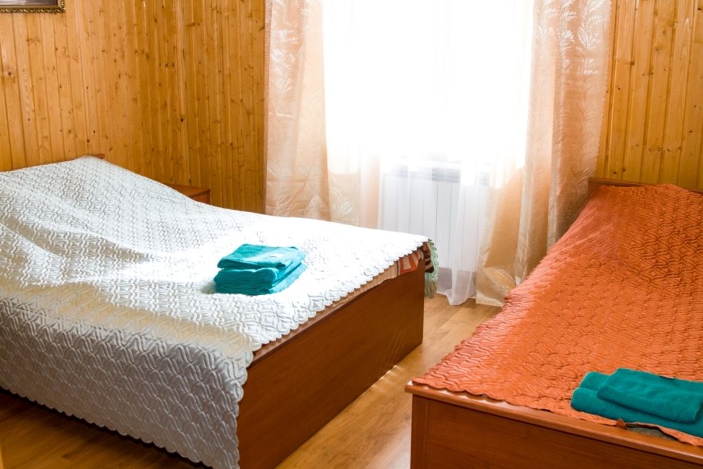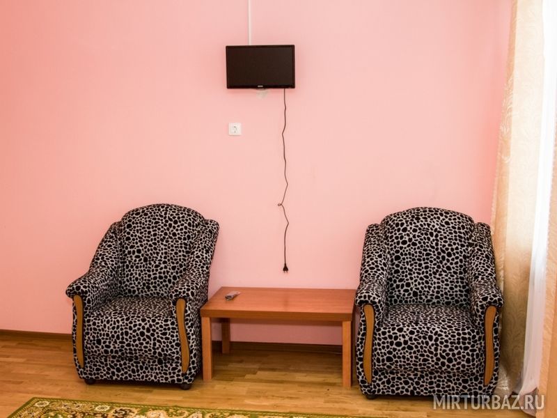 В номере: односпальная + двухспальная кровати, душ или душевая кабинка, горячая, холодная вода, сан.узел. Телевизор, шкаф, тумба прикроватная, журнальный столик. В 4 из 5 номеров балкон.