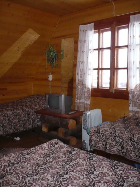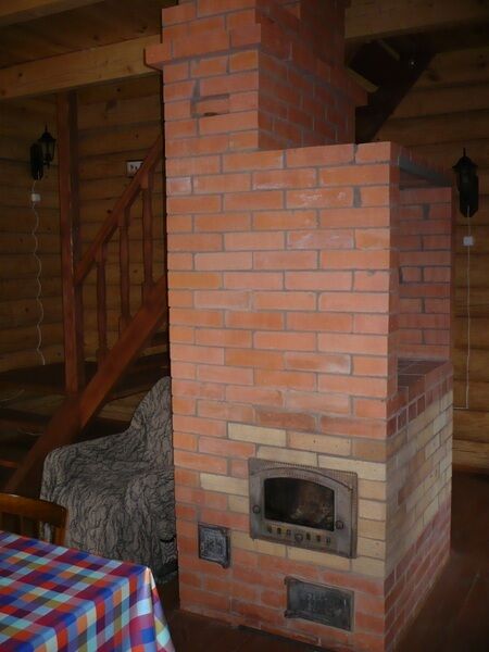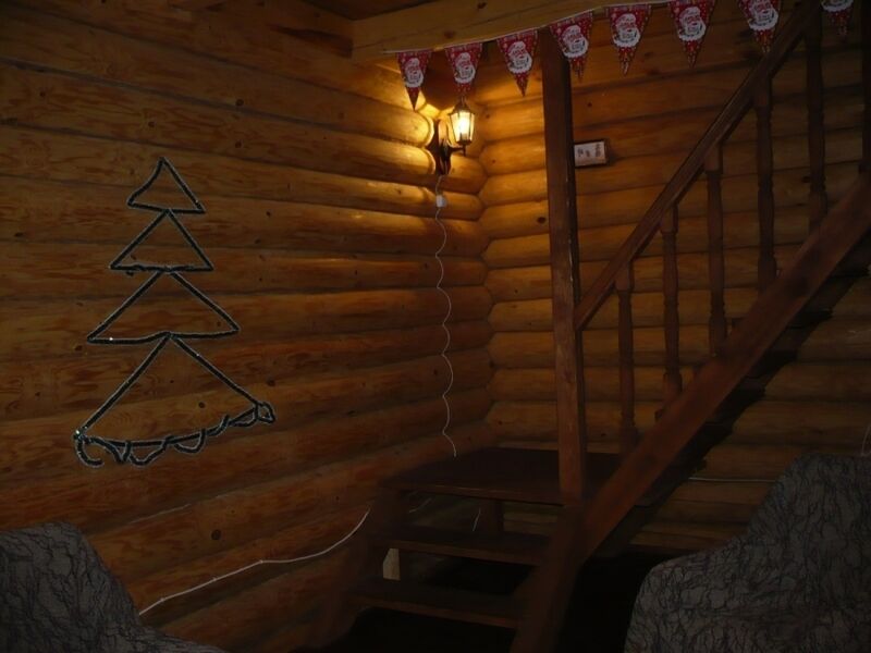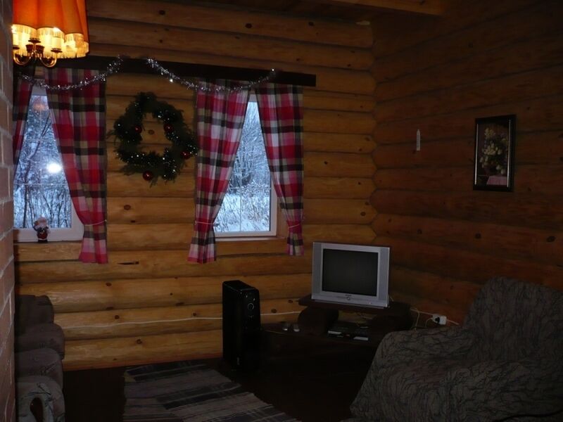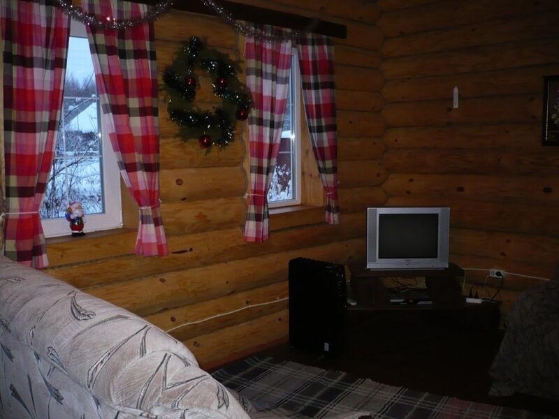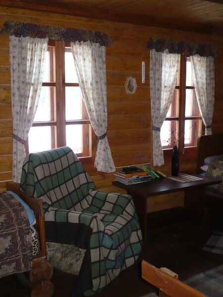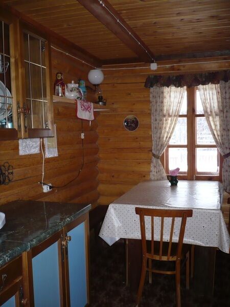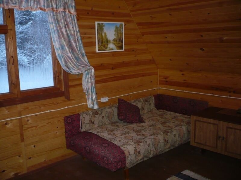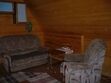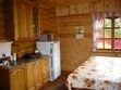 В доме два этажа, две терассы. На первом этаже - кухня-гостиная (холодильник, газовая плита, электрообогреватель, телевизор, микроволновка, посуда) и три спальных места. На втором этаже - комната на четыре спальных места.