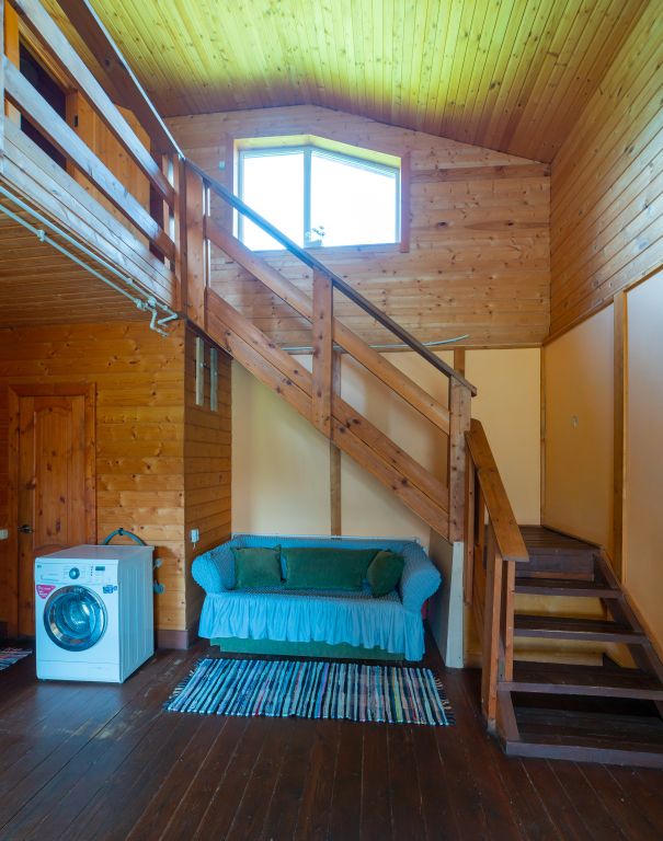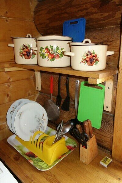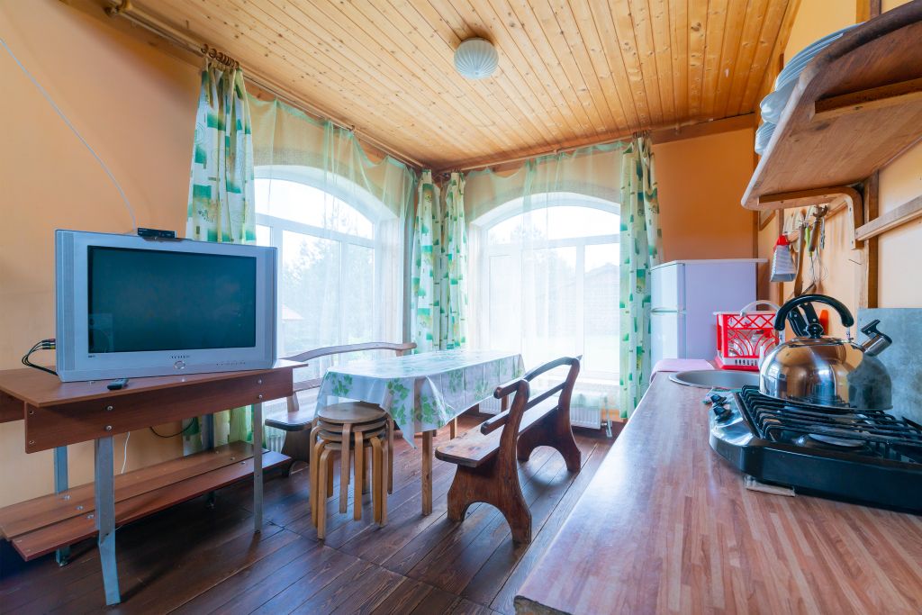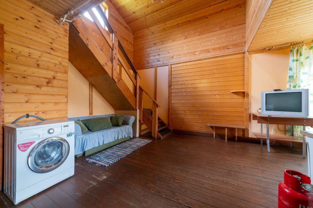 1-й этаж: Гостиная с мягкой мебелью, телевизор, спальня с 2-мя отдельными кроватями, полки для белья, оборудованная кухня с набором посуды, холодильник, газовая плитка, стол и стулья, телевизор (ОРТ, РТР с помехами).