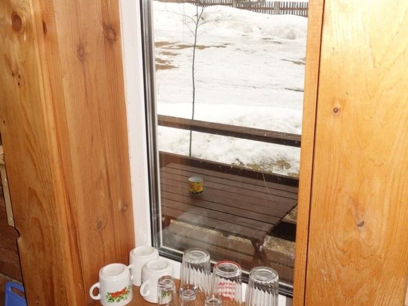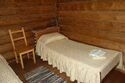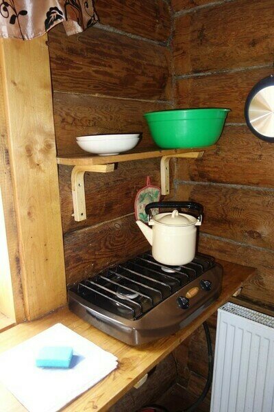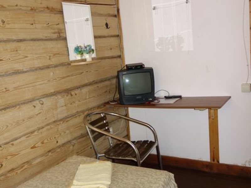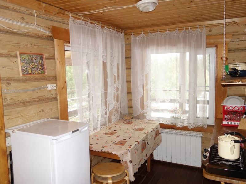 1-й этаж: 2 спальни в каждой по две полуторные кровати, оборудованная мини кухня с набором посуды, холодильник, газовая плитка, стол и стулья, телевизор (ОРТ, РТР с помехами).