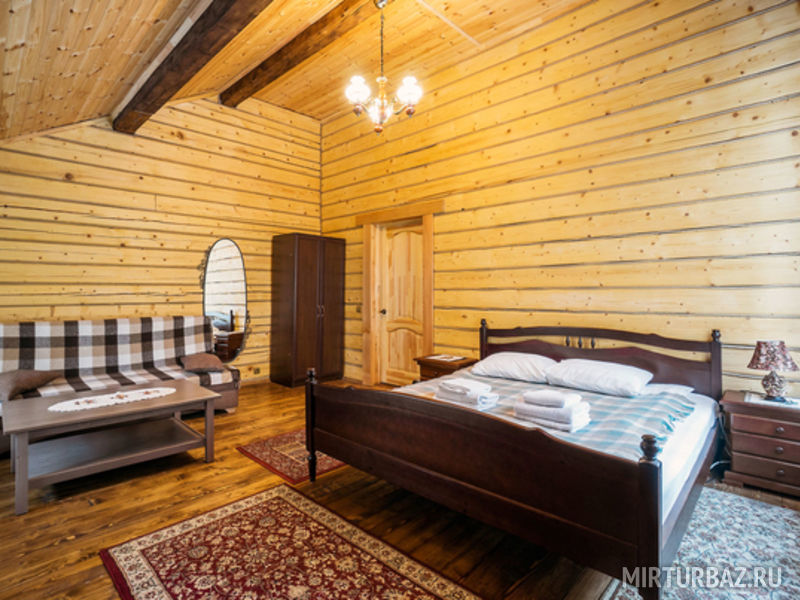Большой просторный номер с большой кроватью и диваном, рассчитанный на четверых гостей со всем необходимым для полноценного отдыха. В номере: