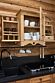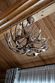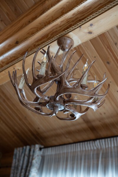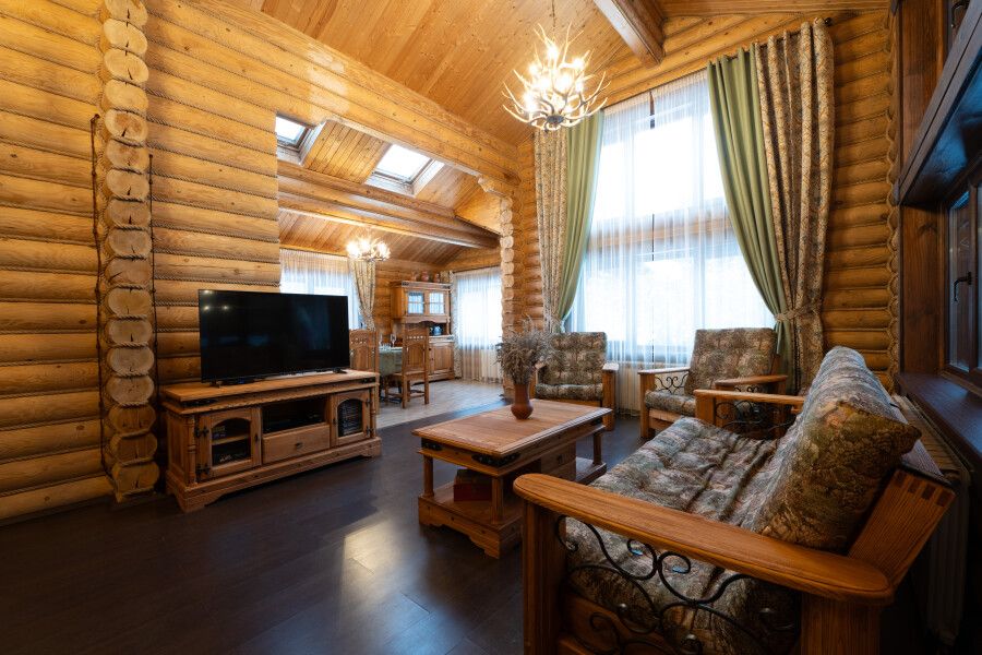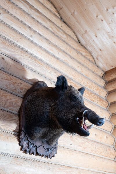 Интерьер дома оформлен в деревенском стиле с массивной мебелью и головой кабана на стене, добавляющей атмосферности в гостиной.