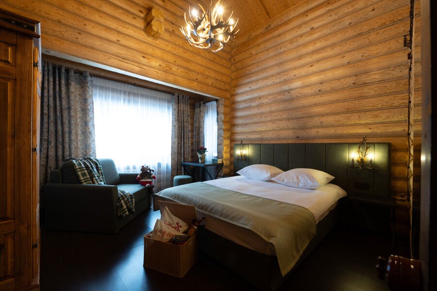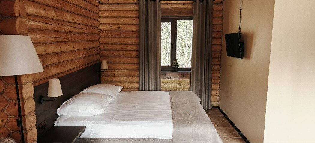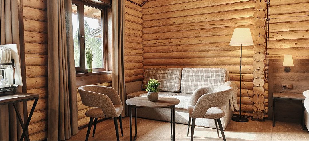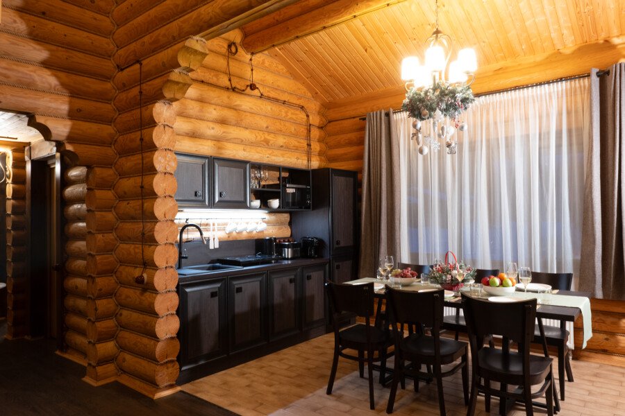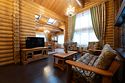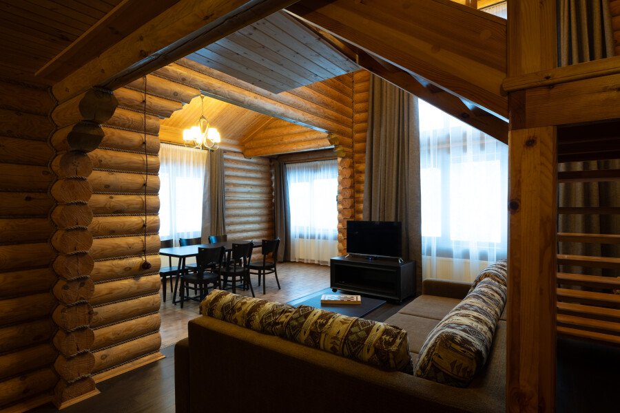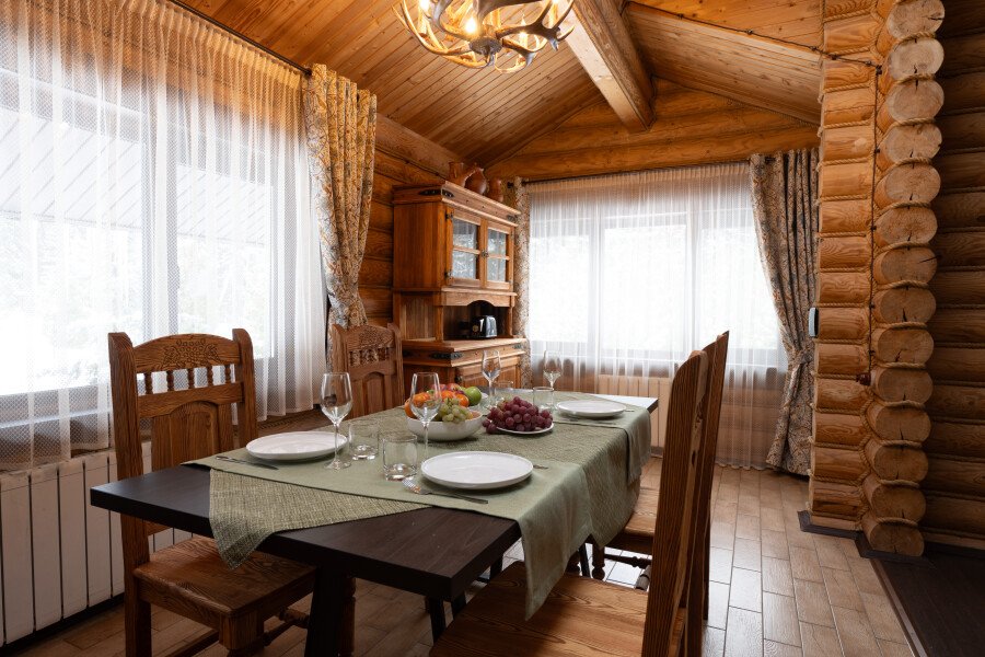 Бревенчатый коттедж с панорамными окнами и величественным видом на лес прекрасно подойдет для семей с детьми или компании друзей до 11 человек.