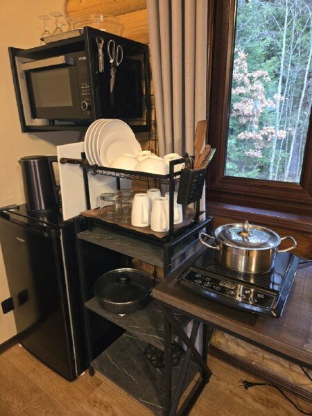 Кухонная зона: кухонный гарнитур с буфетом, плита индукционная 2-х конфорочная настольная, чайник, тостер, холодильник, микроволновая печь, капсульная кофемашина, большой обеденный стол 90*180см и стулья.