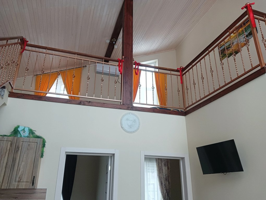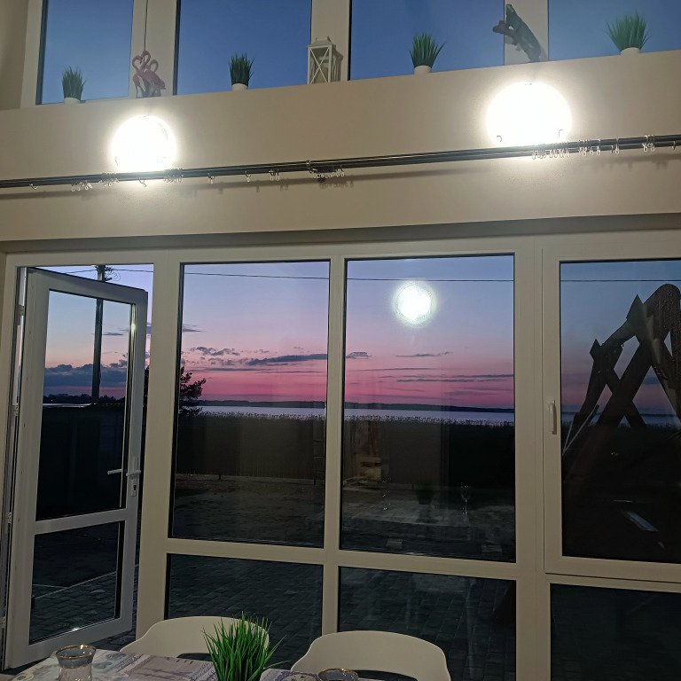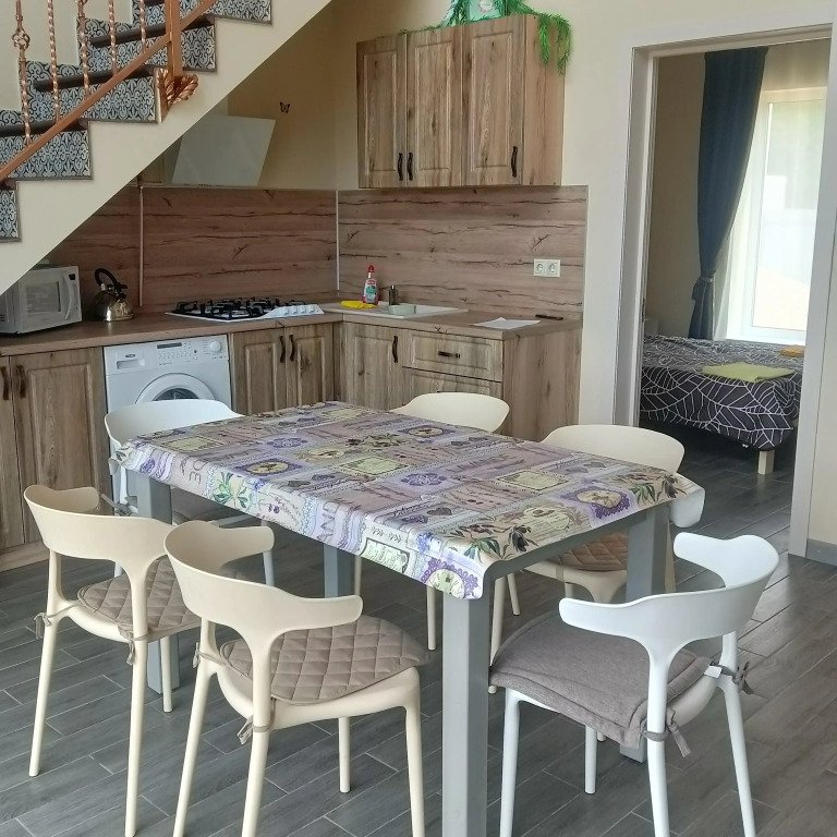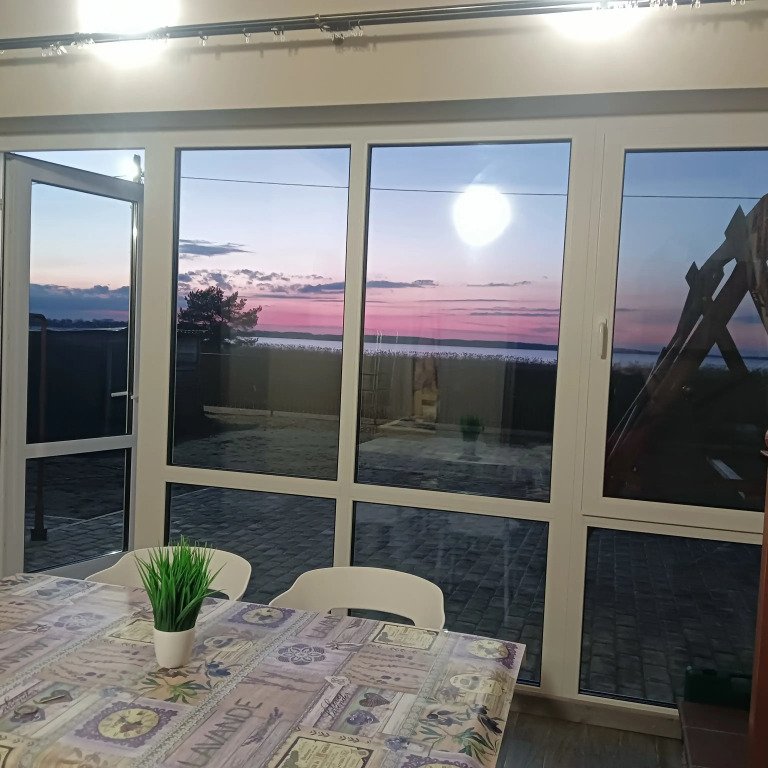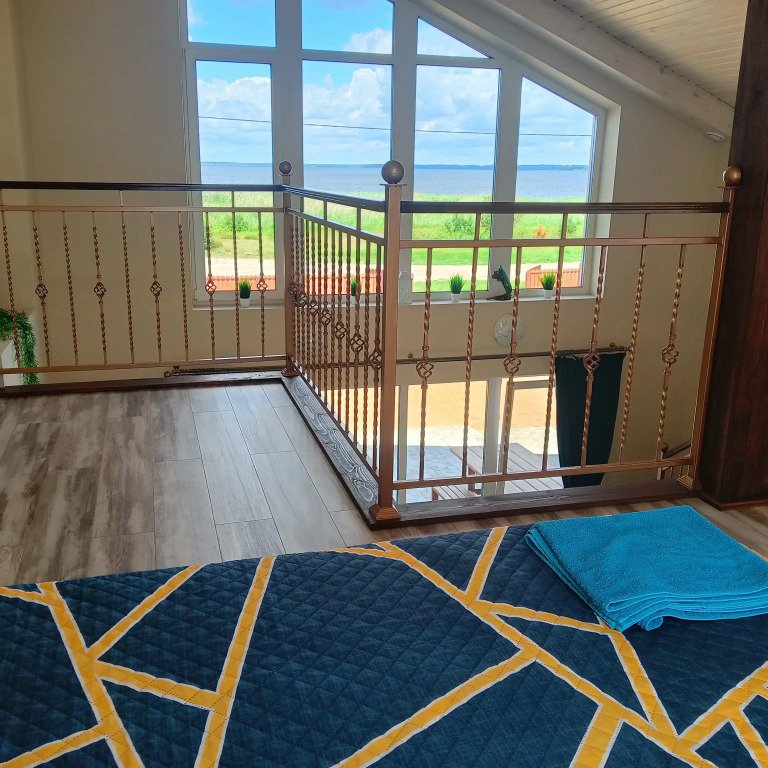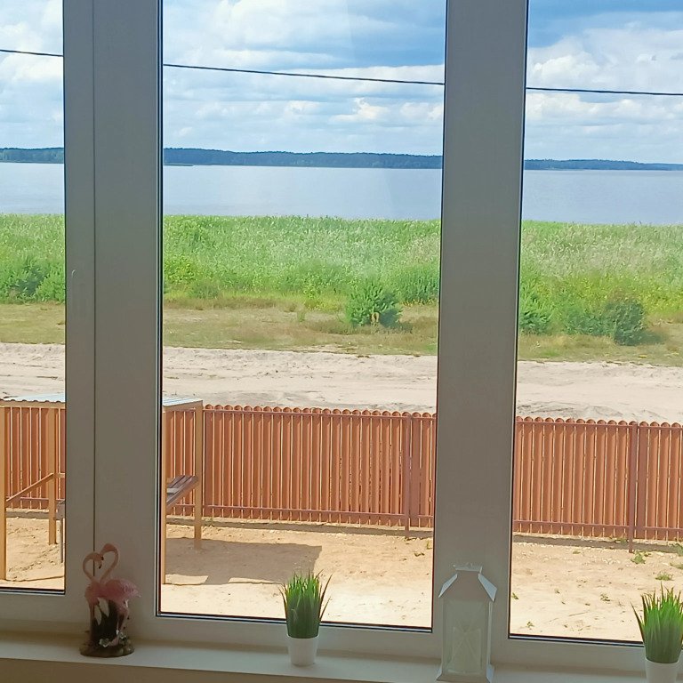 Из окон открывается вид на озеро. Дом рассчитан на 2 семьи и имеет отдельную зону отдыха и вход. В доме: 2 этажа, 3 отдельных помещения, панорамные окна, 2 кровати шириной 1,4 м и 2 односпальные кровати. Для детей предоставляются манеж-кровать и стульчик для кормления. Есть Wi-Fi, телевизор, кондиционер с 15 июня по 15 августа, стиральная машина, микроволновая печь, утюг, гладильная доска, фен, посуда и кухонные принадлежности. Отопление индивидуальное газовое, есть горячая и холодная вода. На территории есть мангал, стол со скамейками, качели, гамак, игрушки для детей. Для приготовления пищи предусмотрены казан, решётки и шампуры без угля. Возможна аренда лодки, SUP-доски или катамарана.